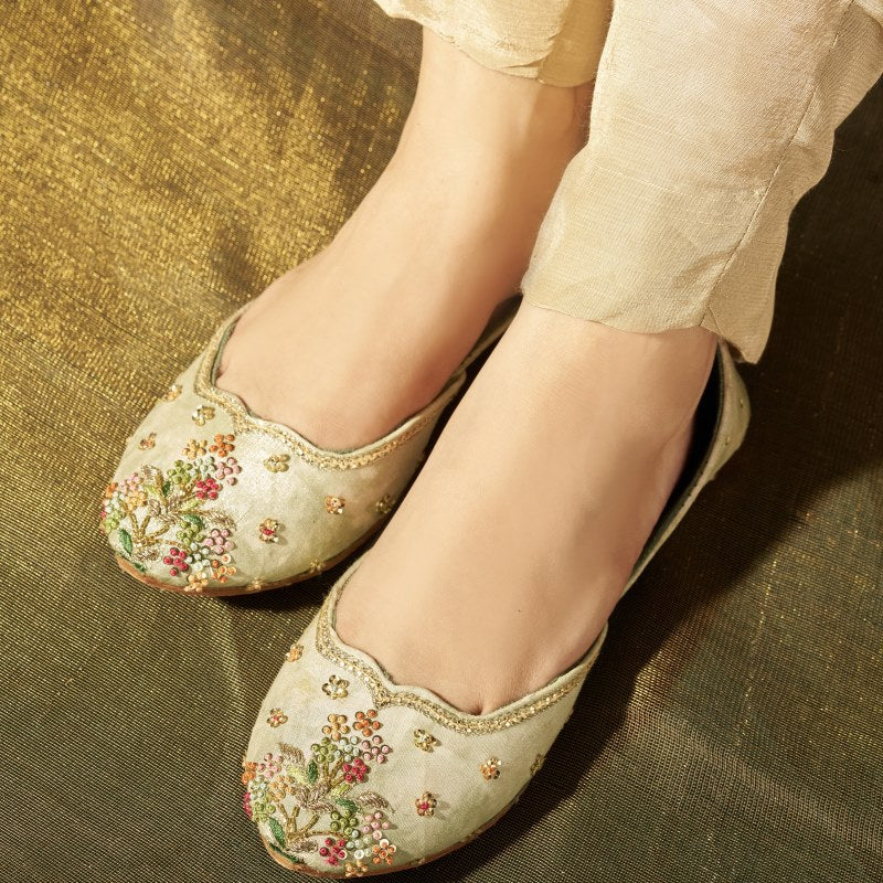 Introducing our exquisitely handcrafted floral embroidered khussas. These elegant shoes feature a delicate array of colorful blossoms and leaves, meticulously stitched onto soft, green tie & dye fabric. The intricate beadwork adds a touch of sparkle and sophistication, while the scalloped edge, embellished with fine gold thread, enhances the luxurious feel of these khussas. Perfect for special occasions or adding a touch of glamour to everyday wear, these juttis combine comfort and timeless beauty. The soft, cushioned insole ensures all-day comfort, while the durable sole provides excellent support. Elevate your footwear collection with these stunning embroidered juttis that bring artistry and elegance to your style.