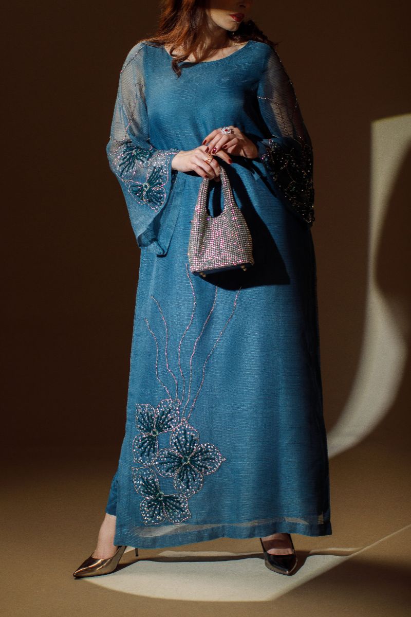 Elegant teal long shirt with shimmering sequins and pearl handwork on the sleeves and border, paired with straight trousers for a chic, refined look