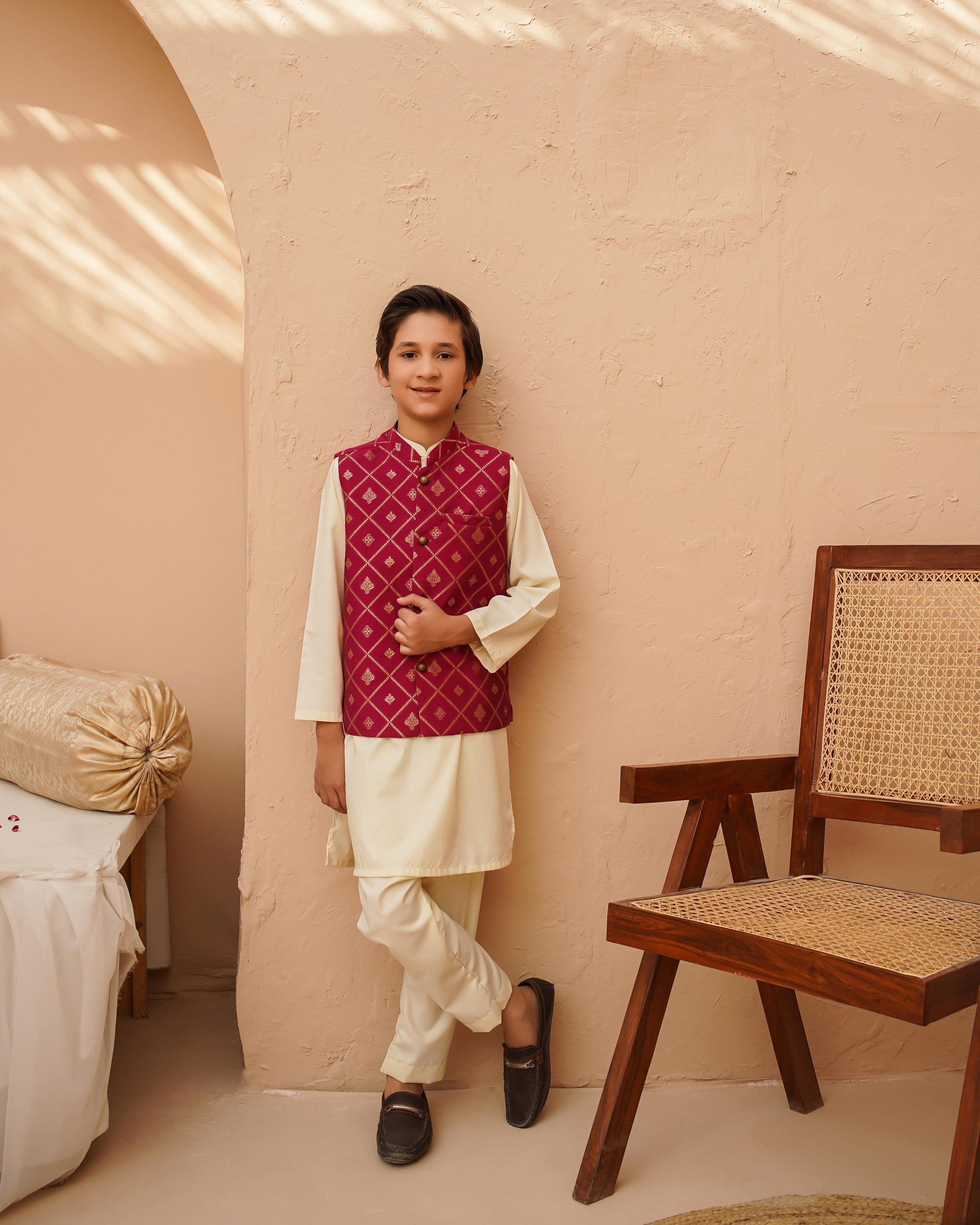 Dress your little gentleman in this sophisticated three-piece ensemble featuring a printed jacquard pink waistcoat, paired with a cream wash-and-wear kurta and pajama. Designed for comfort and style.