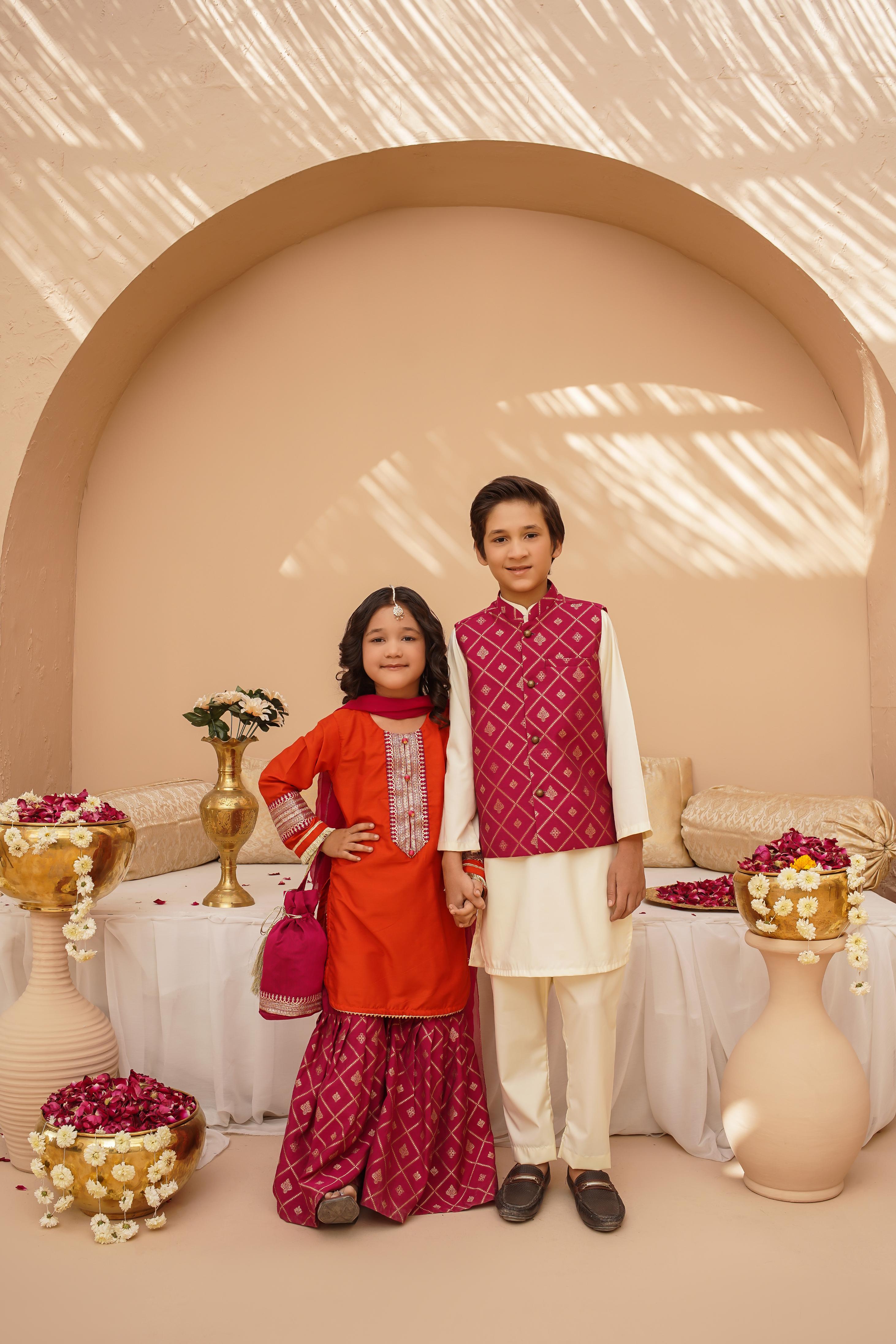 The top is crafted from luxurious cotton silk, featuring intricate Zari and sequins embroidery on the neckline and sleeves, adding a touch of sparkle and grace.The bottom is a stunning jacquard-printed gharara with lightweight chiffon dupatta.