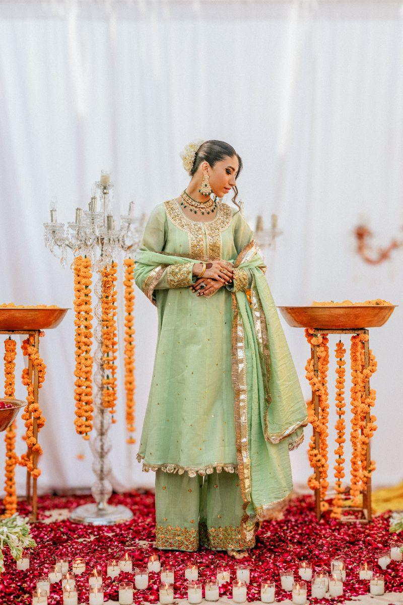 Heavily gota tikli embellished 4 kalli uma green kurta with kamdani chan all over paired with similar dhaka pajama and gota finished dupatta with chan.