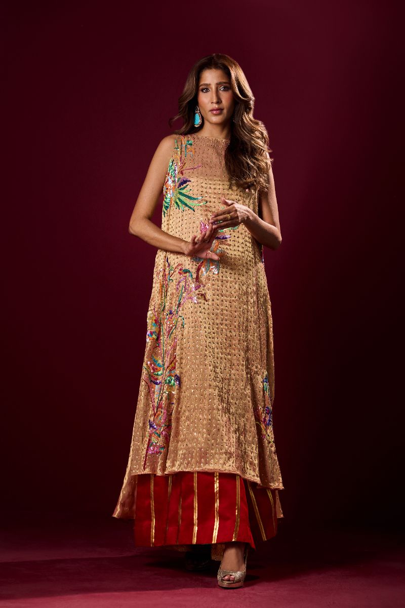 This timeless ensemble begins with a handwoven jamawar shirt, its bold gold patterns exuding regal elegance and old-world grandeur. Draped with a striking doshala, one side in rich rani pink intricately hand-embroidered with a captivating madhubani fish motif, further adorned with sitara and zardozi that shimmer like jewels in motion while the other side unveils pure silk in vibrant orange and red, block-print. Paired alongside is a vibrant hot pink gharara, delicately embroidered all over and finished with gota, adding a festive glow and graceful movement. Together, the pieces weave a story of heritage, artistry, and celebration in every detail.
