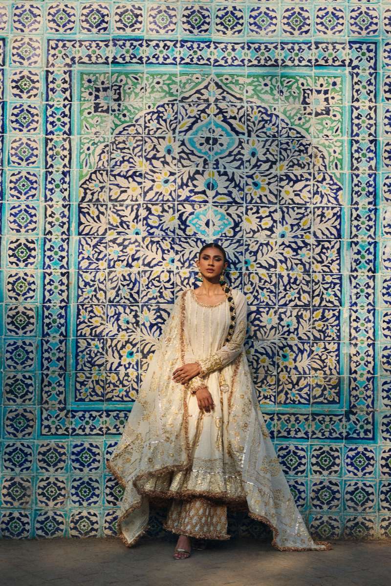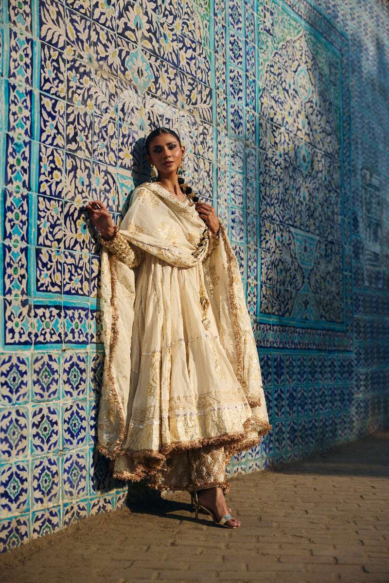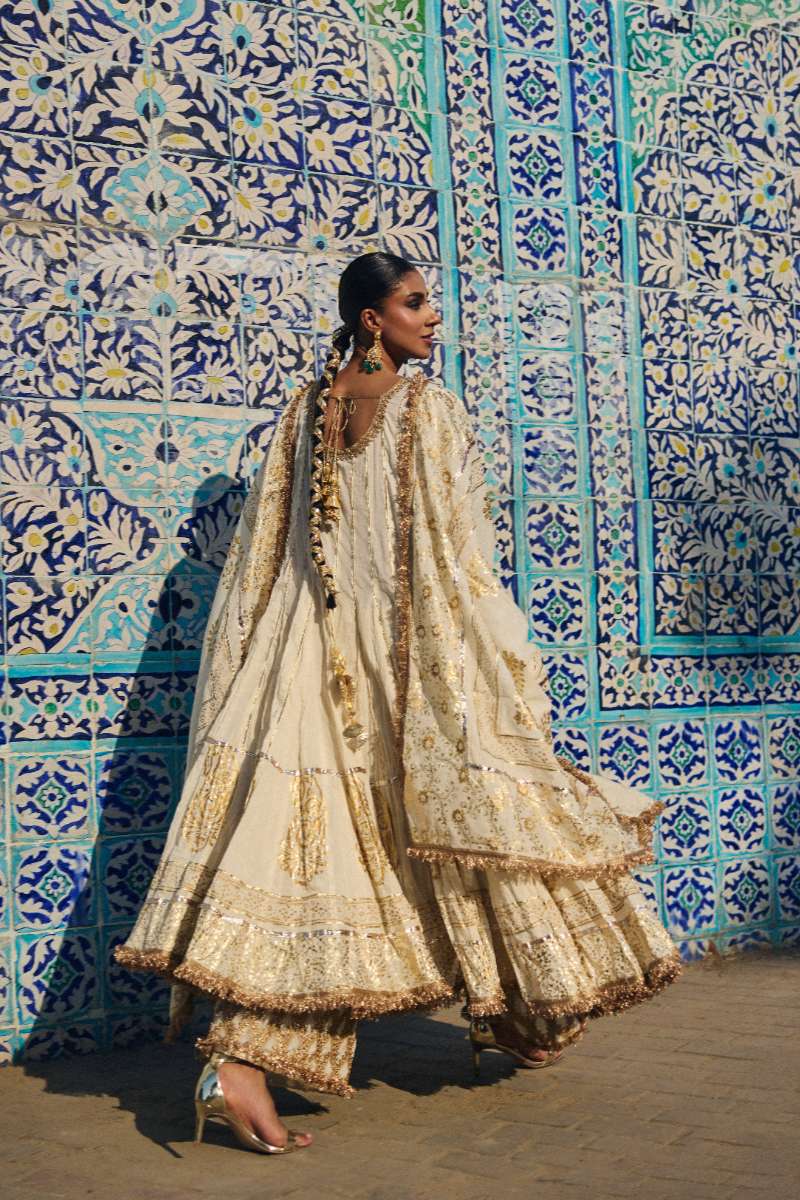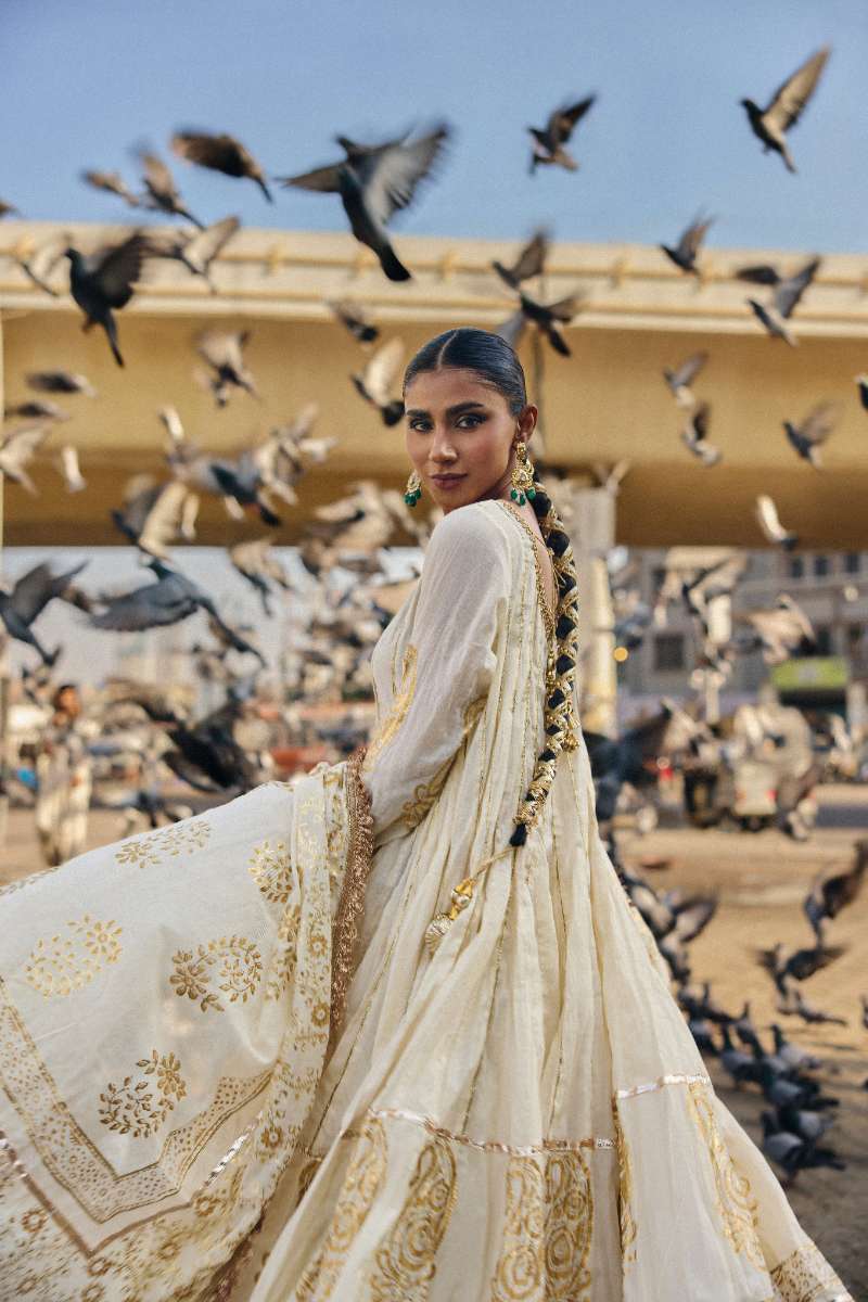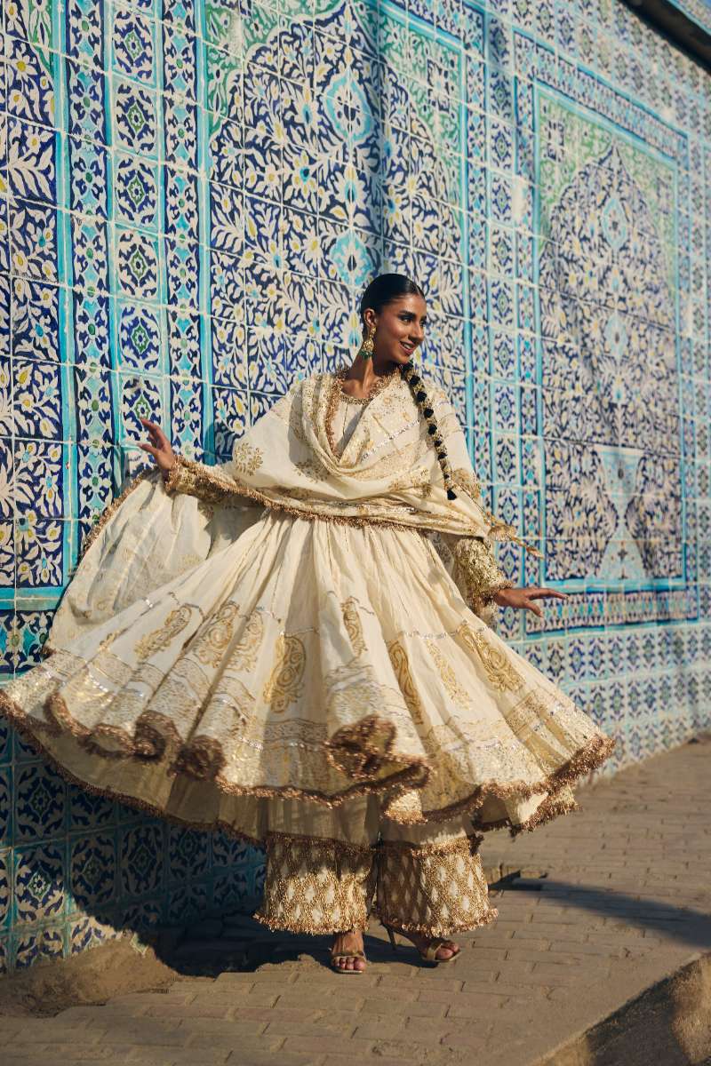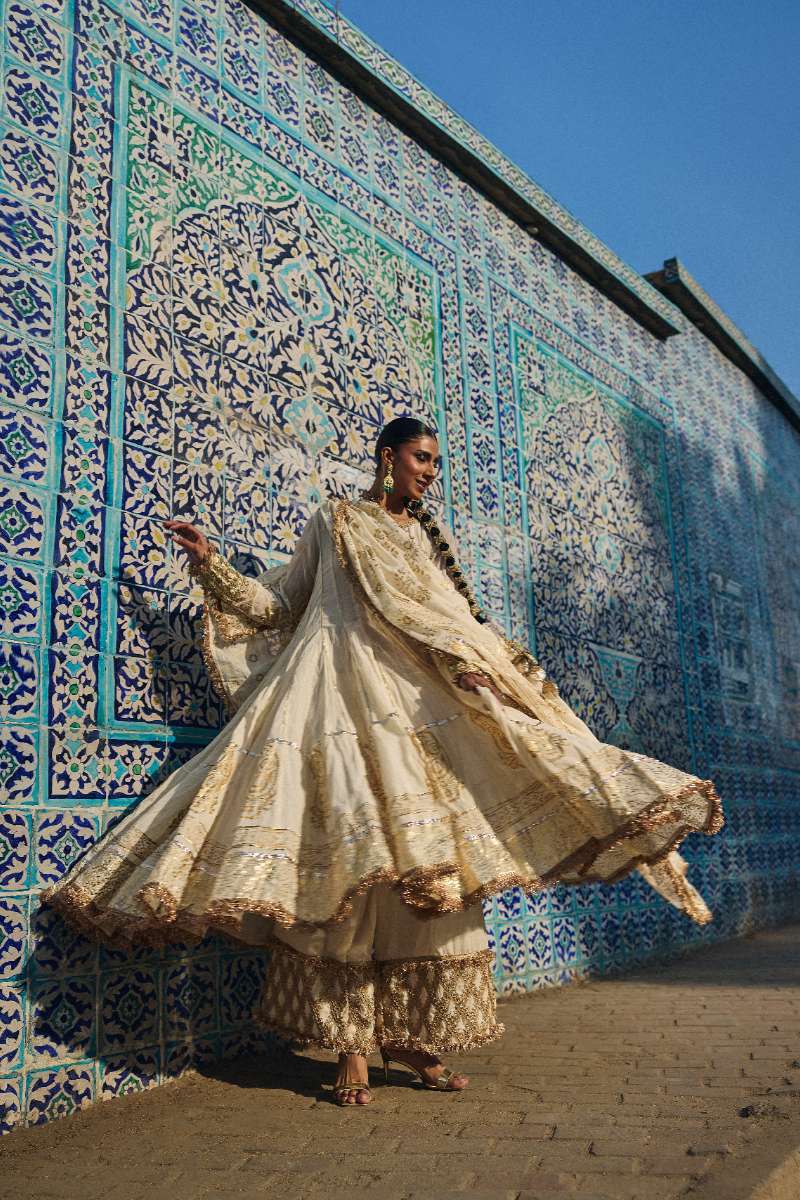 Jugni is a beautifully crafted three-piece ensemble made from pure hand-woven muslin, giving the outfit a naturally rich and graceful presence. Its signature 64-kalidaar cut creates an elegant, sweeping flare with every step, adding timeless charm and sophistication. The design features a stunning combination of foil printing and traditional gold block printing, creating a radiant, regal finish across the panels. Heavy gota work enhances its festive appeal, adding classic richness and depth without overwhelming the look. Refined, luxurious, and perfect for celebratory moments, Jugni is an exceptional choice for nikah ceremonies, weddings, and any occasion where tradition and elegance come together beautifully.