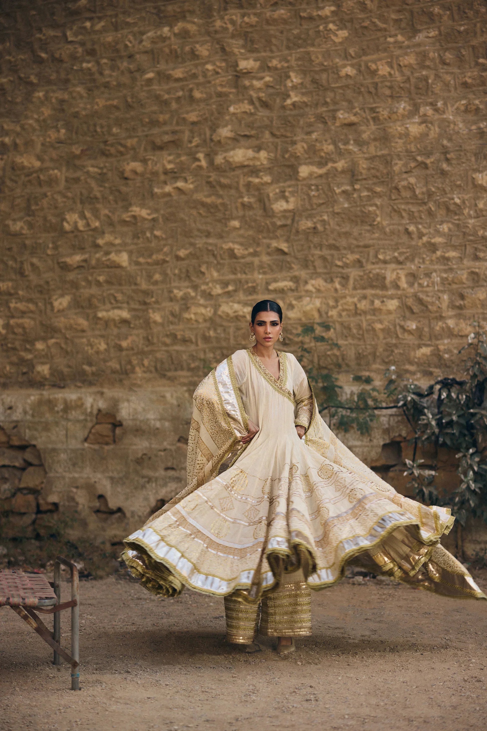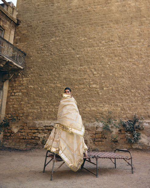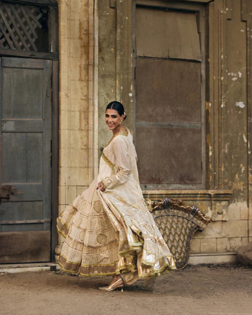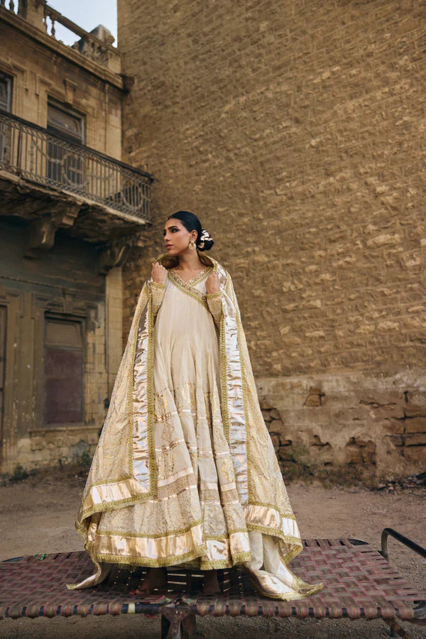 Nath is a striking three-piece Angarkha ensemble crafted from pure hand-woven muslin, designed to offer beautiful volume and a naturally graceful drape. The traditional Angarkha cut gives the outfit a flowing, layered silhouette that moves effortlessly, adding both presence and poise. The ensemble features hand-embellished kota details that bring a soft sparkle and refined texture, enhancing the richness of the overall look. Foil printing and subtle gold accents add depth and elegance, making the outfit glow with a quiet, regal charm. Nath is luxurious yet timeless, perfect for nikah ceremonies, wedding festivities, and any occasion where you want to step into a statement of culture, beauty, and immaculate craftsmanship.