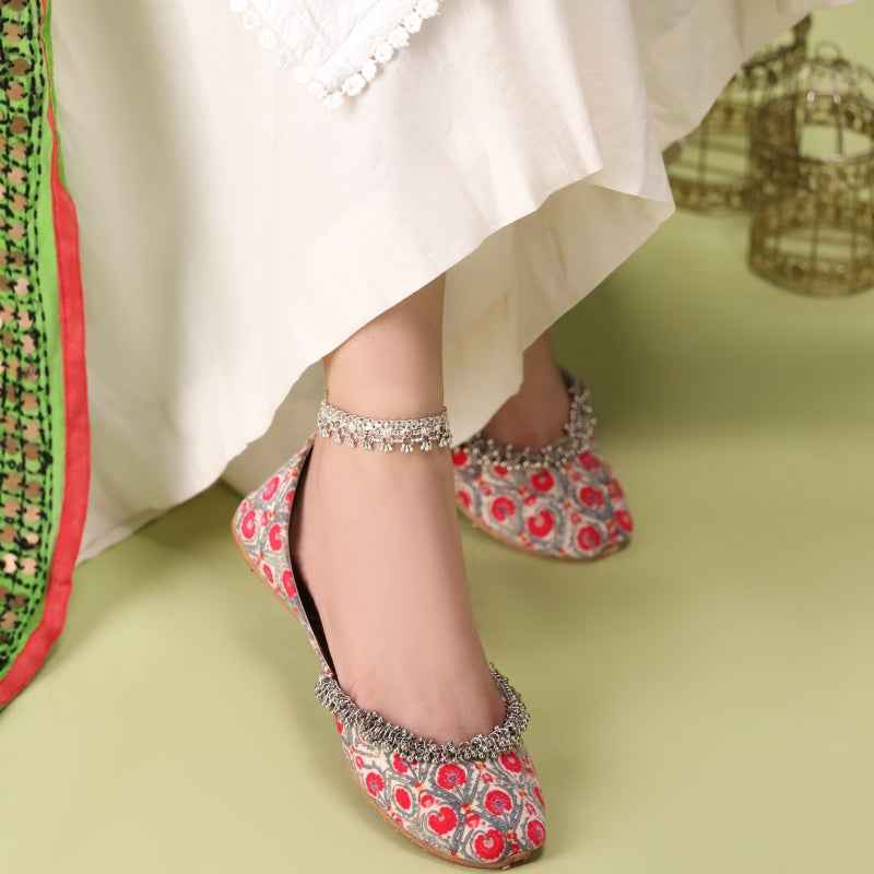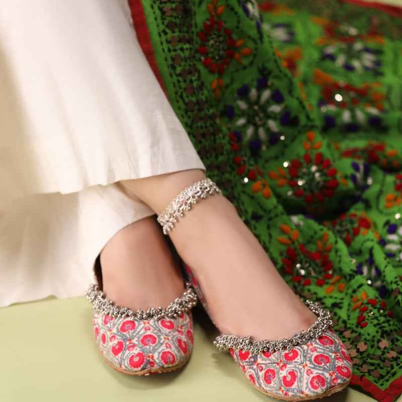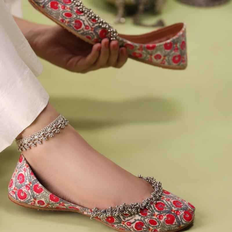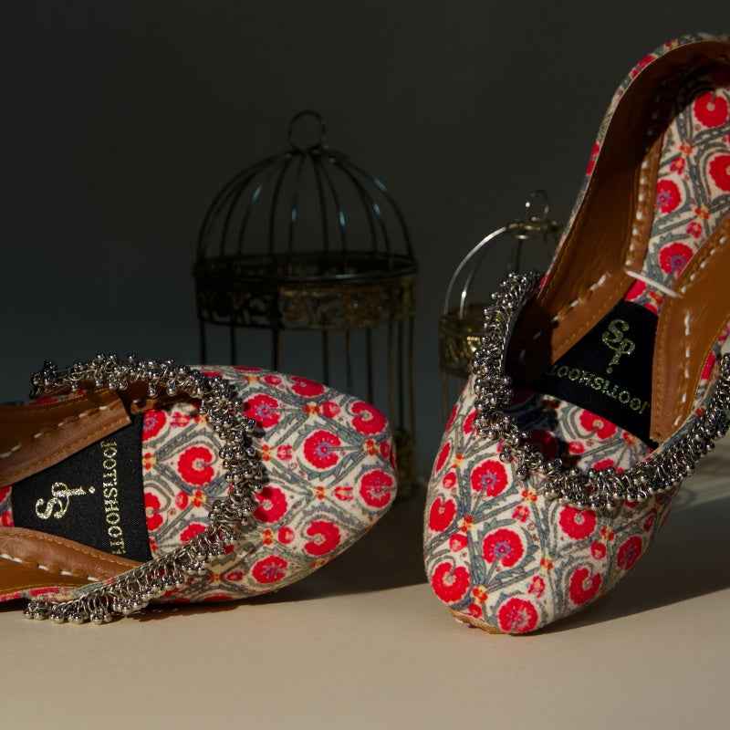 Our Pomegranate Lattice khussa features bold ruby-red pomegranate motifs digitally printed on velvet, drawing inspiration from traditional block-printing techniques and is framed by a delicate metallic-bead fringe that catches the light with every step. As each pair is assembled entirely by hand, slight variations in print intensity and bead placement make yours truly one-of-a-kind. Style them with crisp white linen trousers and silver anklets for a vibrant daytime look, or let the ruby-red lattice pop against a charcoal kurta for evening allure. To keep them looking their best, gently spot-clean with a damp cloth and store in a cool, dry place away from direct sunlight.
