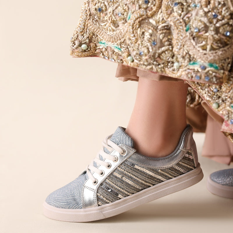 Shimmering metallic silver panels meet rows of sparkling sequins and subtle mesh knit, all atop a supportive, molded-cushion sole—your go-to for eye-catching shine and next-level comfort.