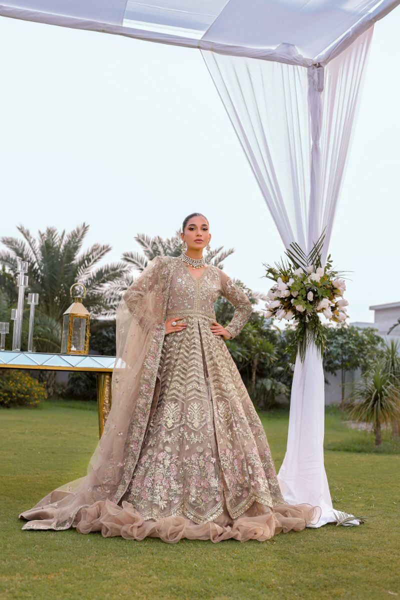 This outfit truly embodies beauty and elegance. Presenting our stunning pishwas, designed to exude timeless charm. Adorned with intricate embellishments that brilliantly enhance the tissue lengha, it’s a showstopper. Paired with a regal, embroidered dupatta, this ensemble is perfect for making a statement at your special occasion.