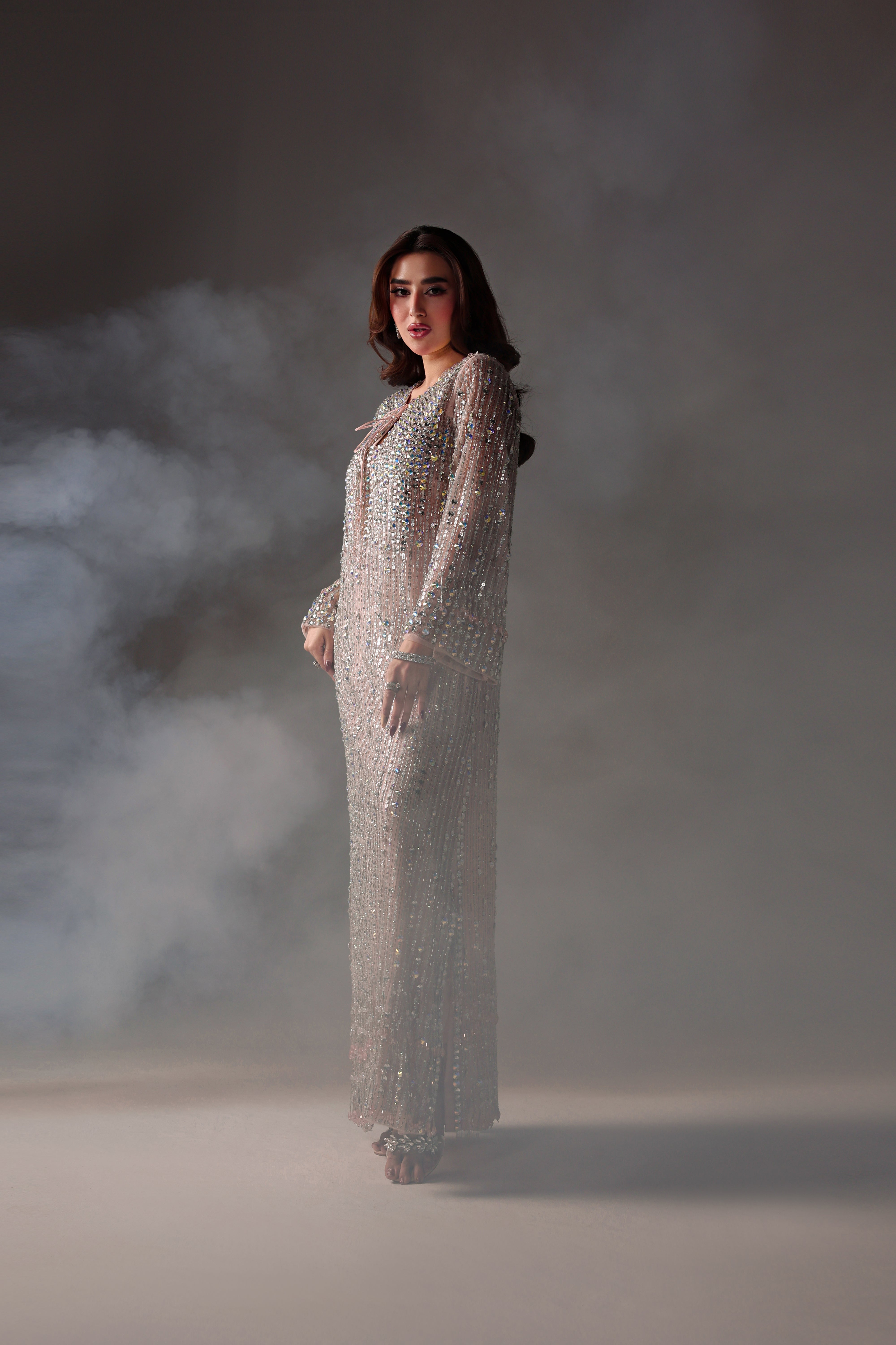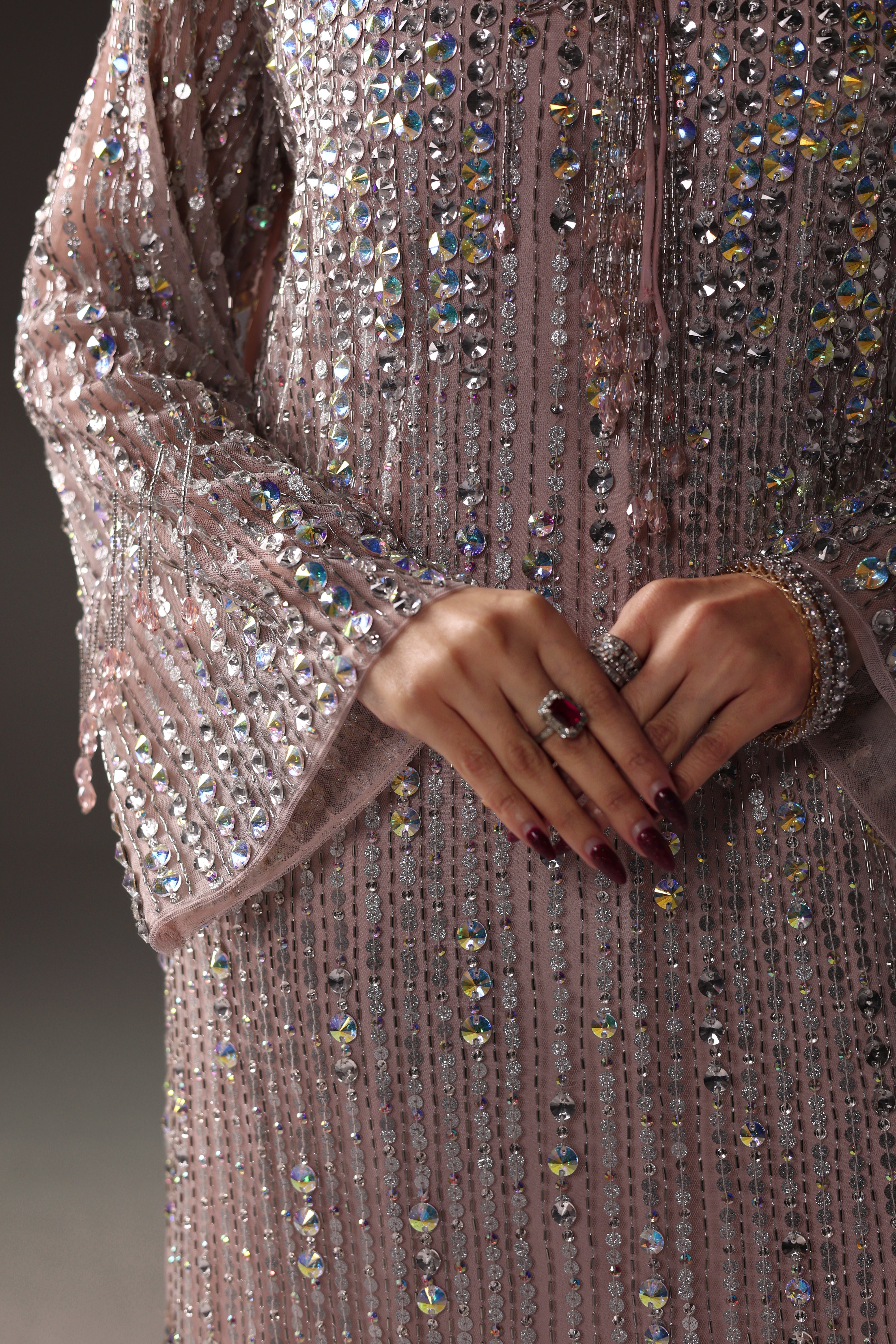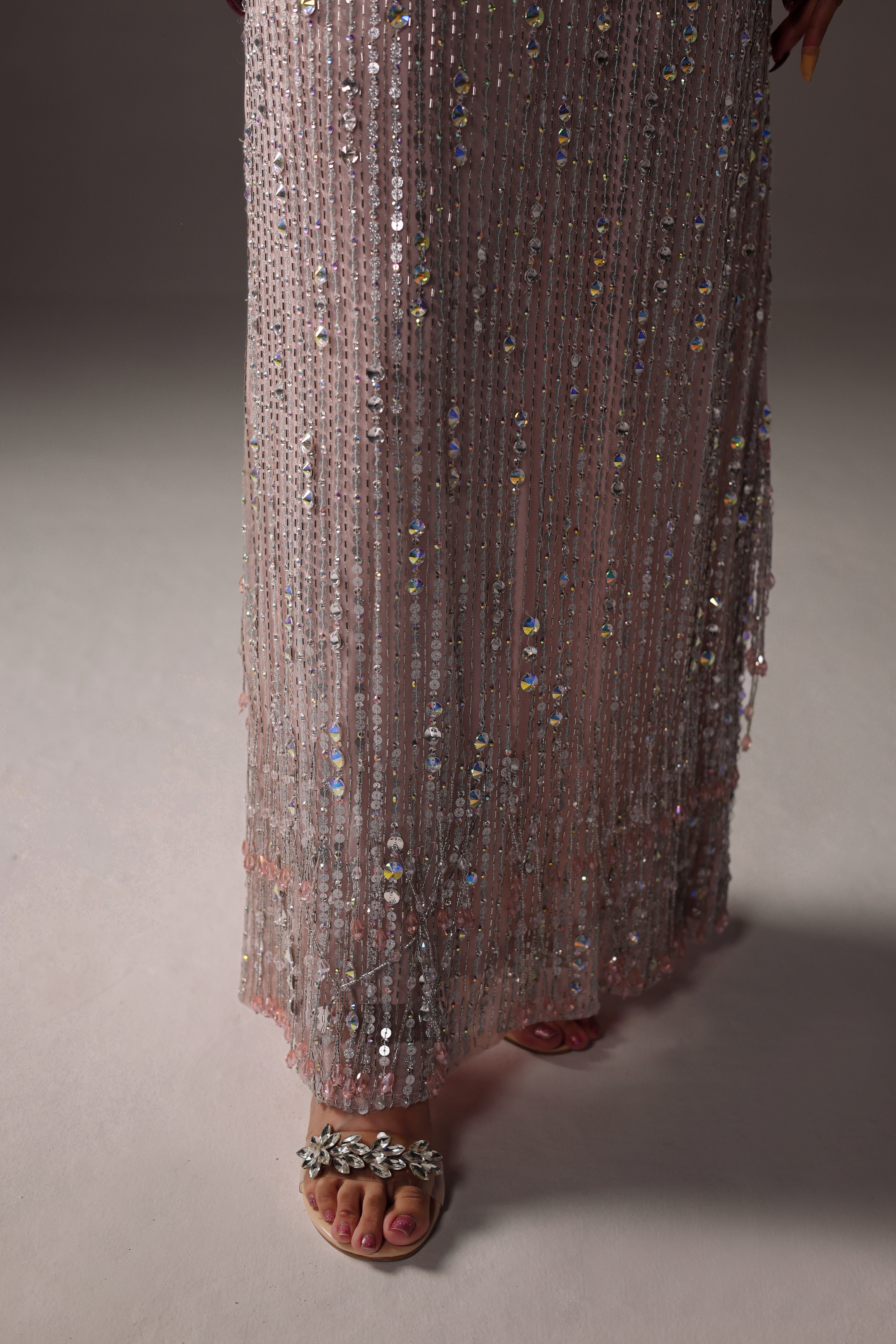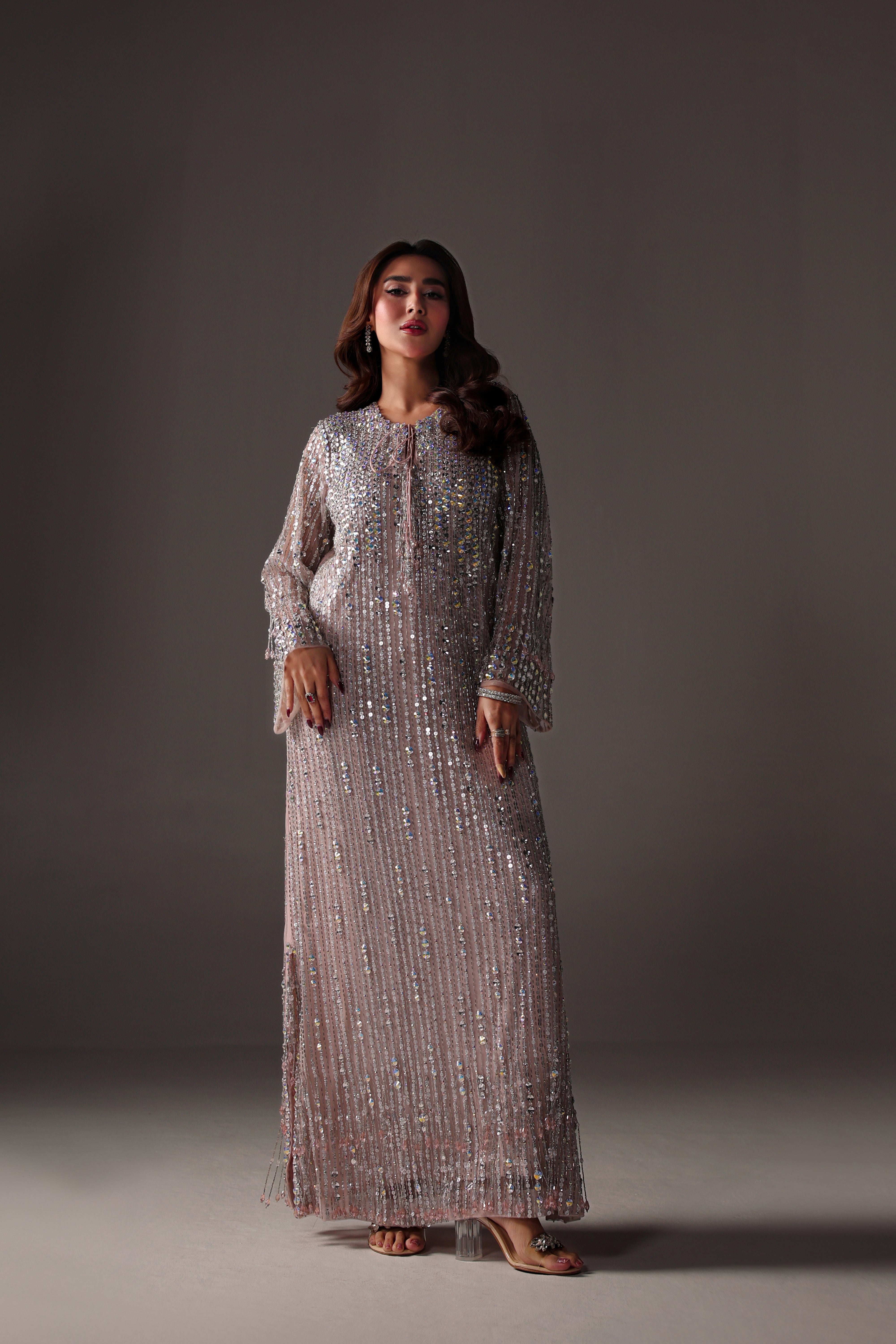 Miran is a soft pink, featuring a exquisitely embellished net kaftan adorned with crystals, stones, cutdana, and Swarovski elements. Paired with raw silk pants for a sophisticated silhouette, this meticulously crafted outfit exudes elegance and provides a bold, modern formal statement.