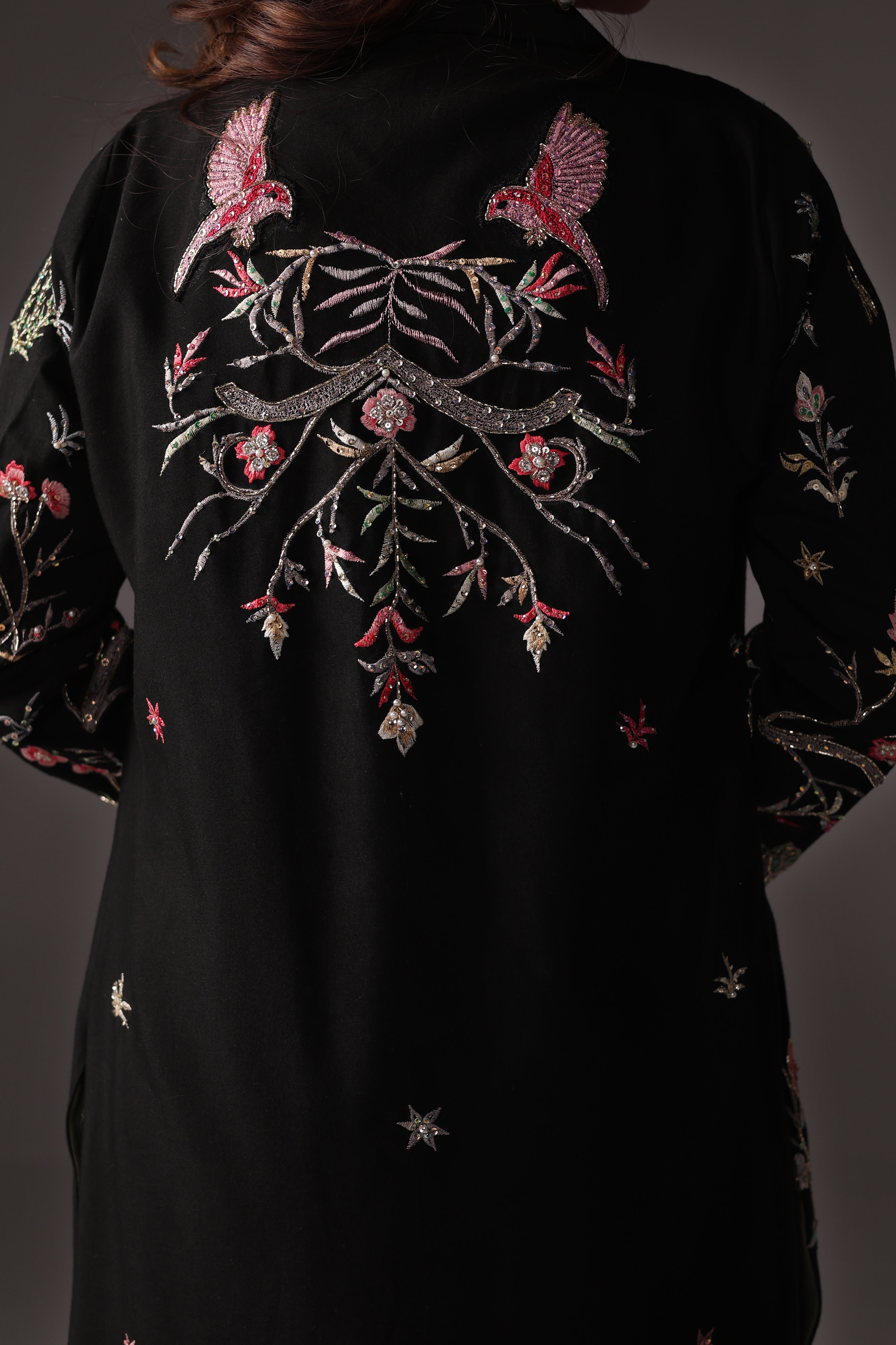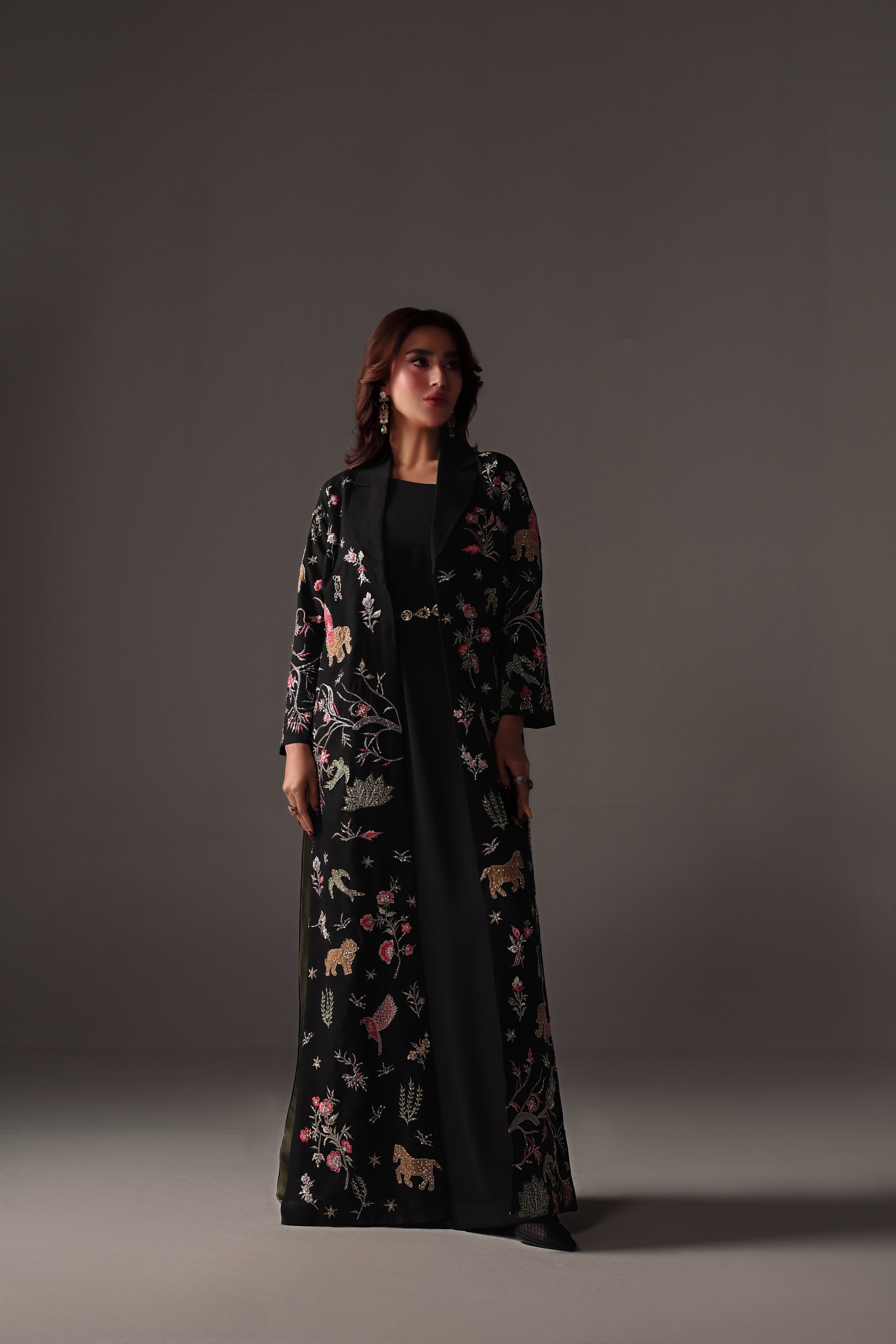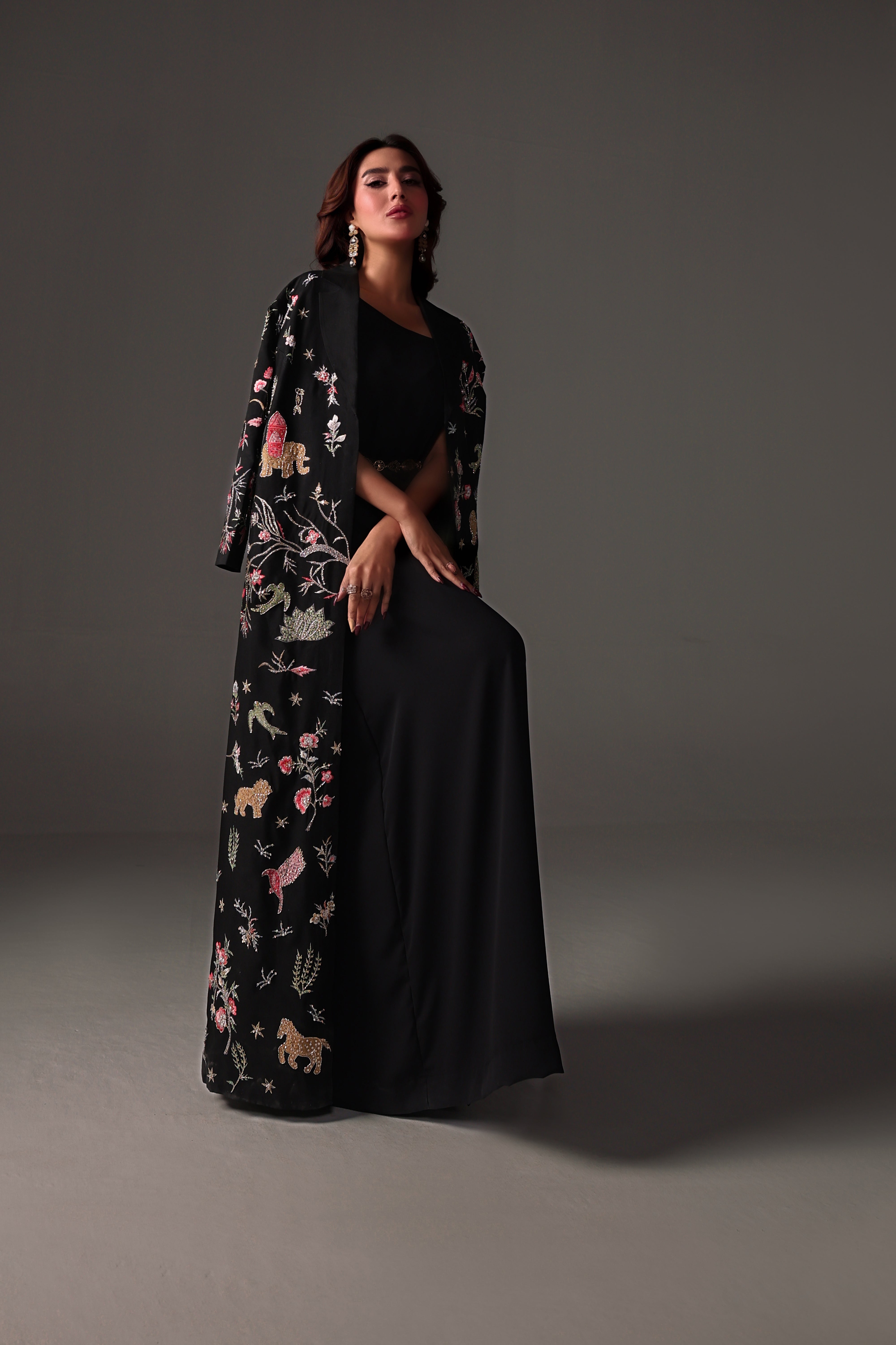 Nera is a striking black ensemble crafted for bold, effortless elegance. The raw silk jacket is adorned with refined embroidery enhanced by cutdana, sequins, and crystal detailing, imparting a subtle yet captivating shine. Paired with a soft georgette gown and a statement gold belt, this designed outfit presents a sleek, modern silhouette ideal for evening formals. Nera embodies a clean, structured, and timeless aesthetic.