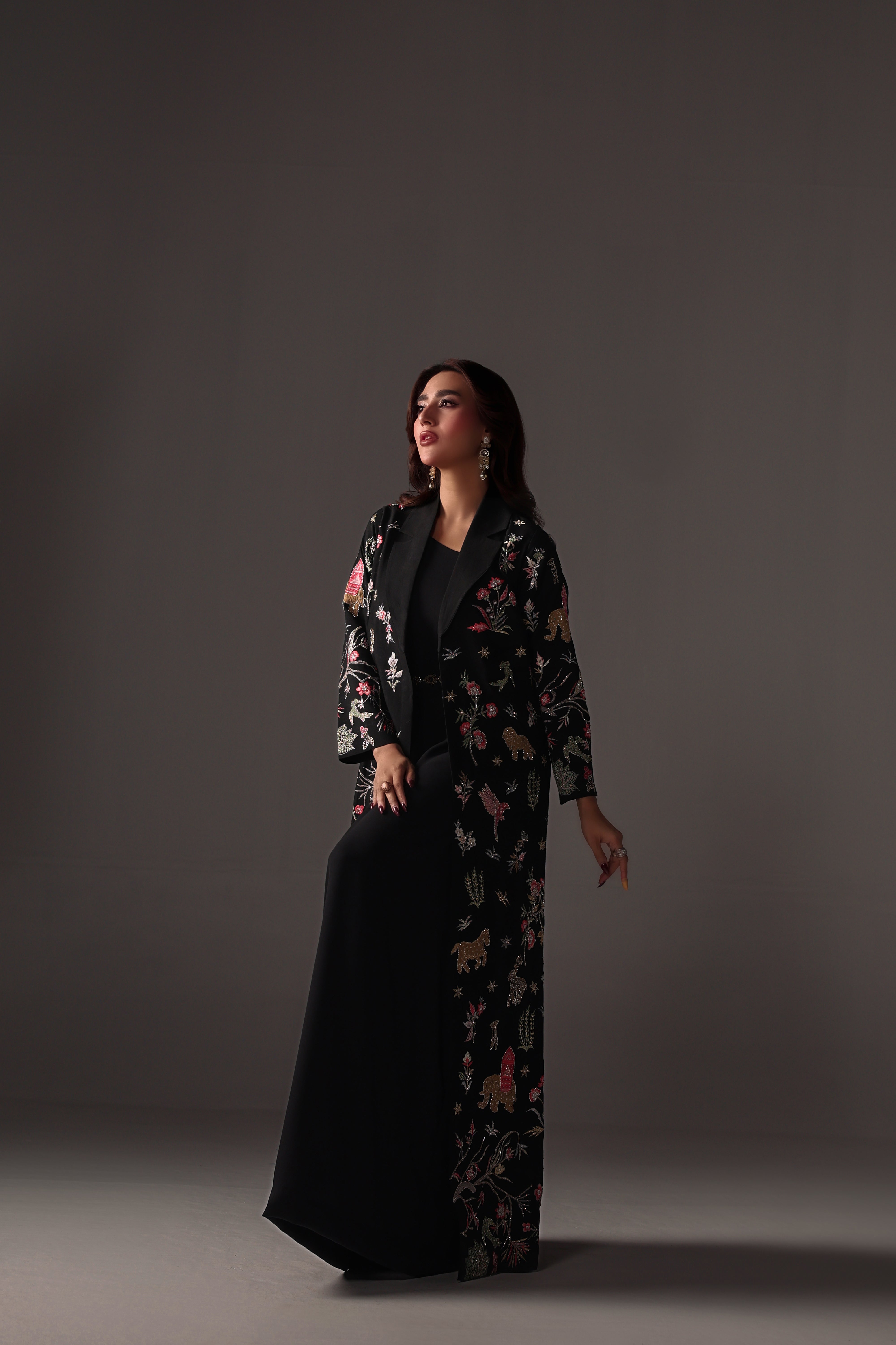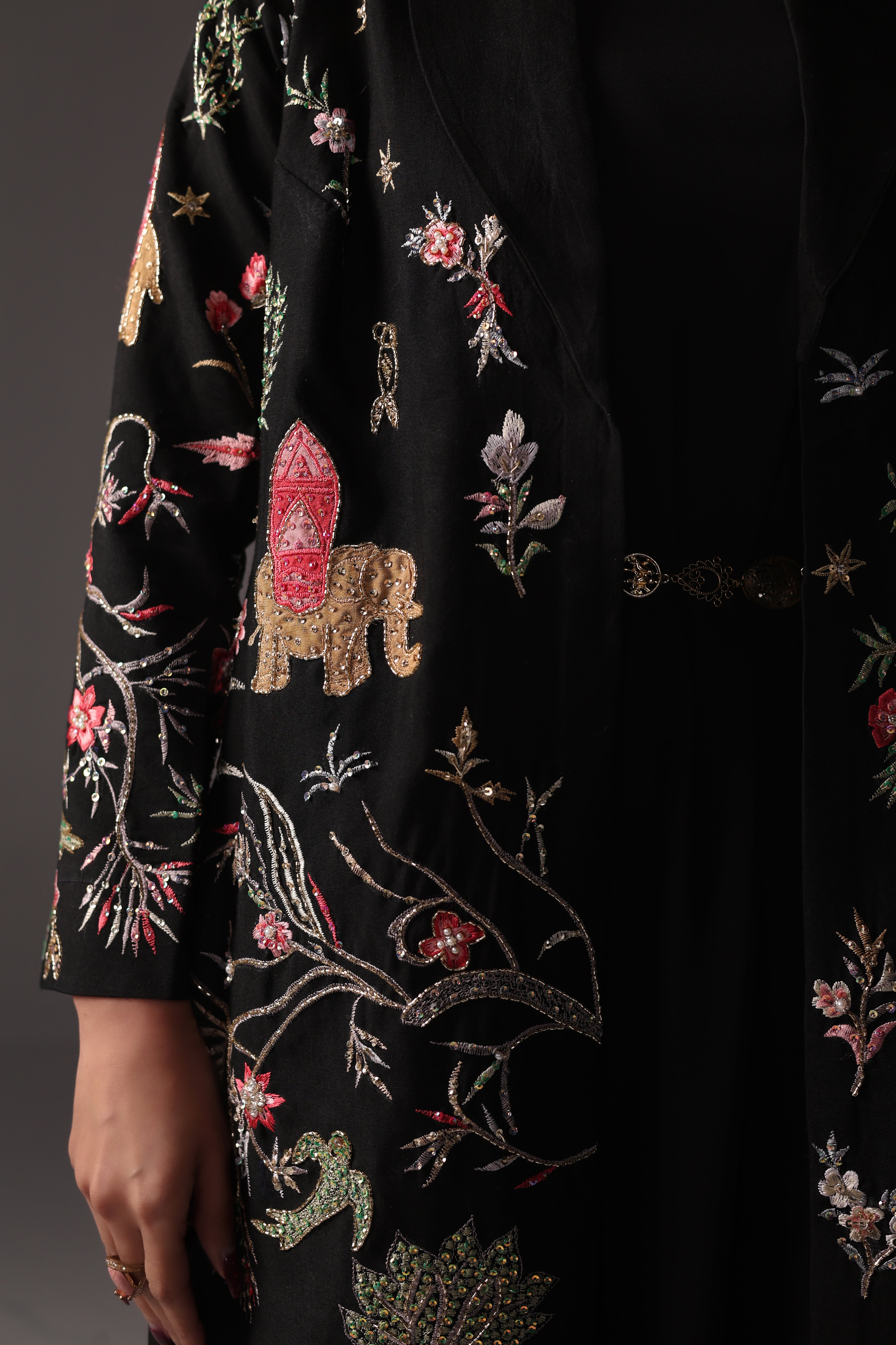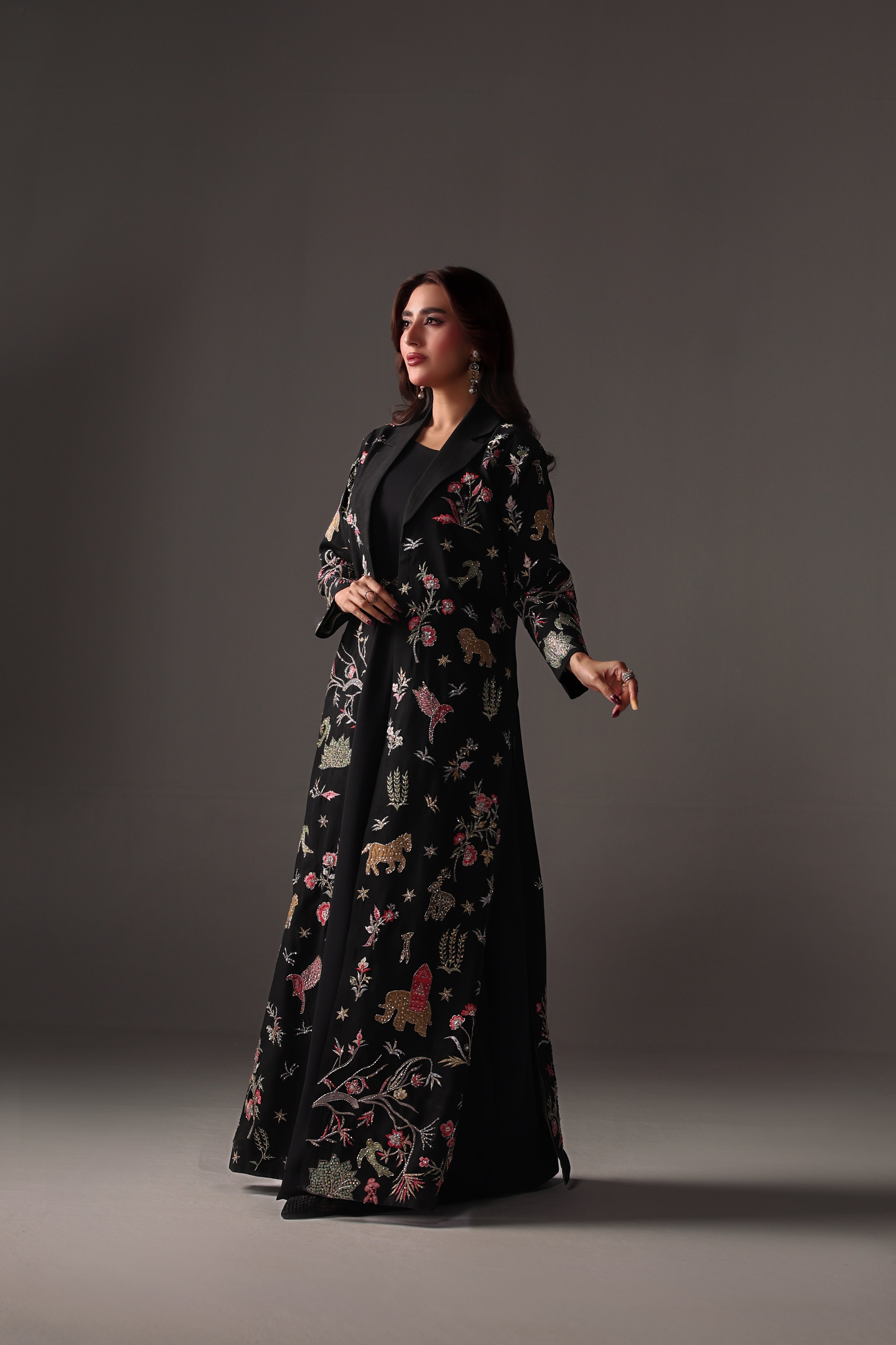 Nera is a striking black ensemble crafted for bold, effortless elegance. The raw silk jacket is adorned with refined embroidery enhanced by cutdana, sequins, and crystal detailing, imparting a subtle yet captivating shine. Paired with a soft georgette gown and a statement gold belt, this designed outfit presents a sleek, modern silhouette ideal for evening formals. Nera embodies a clean, structured, and timeless aesthetic.