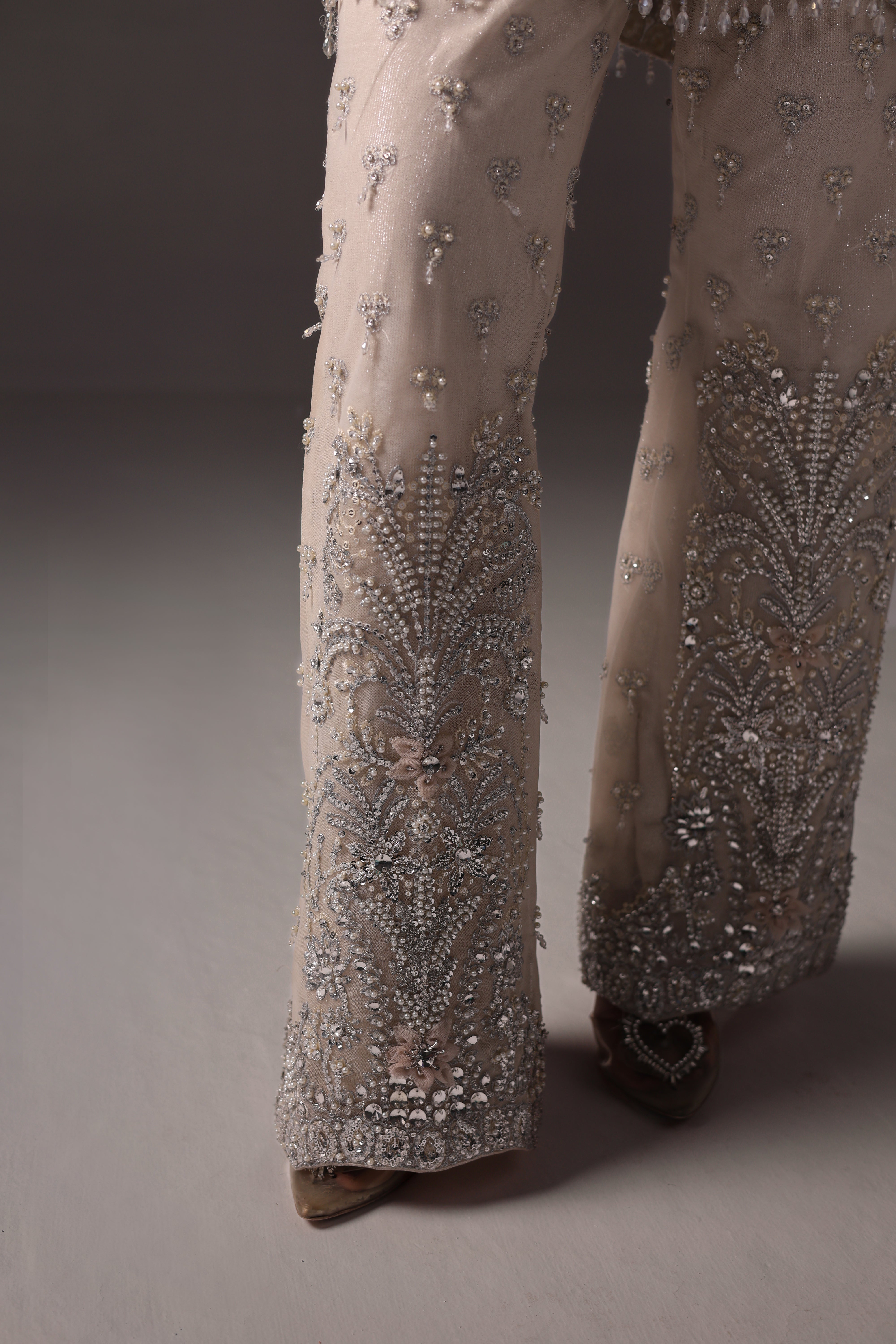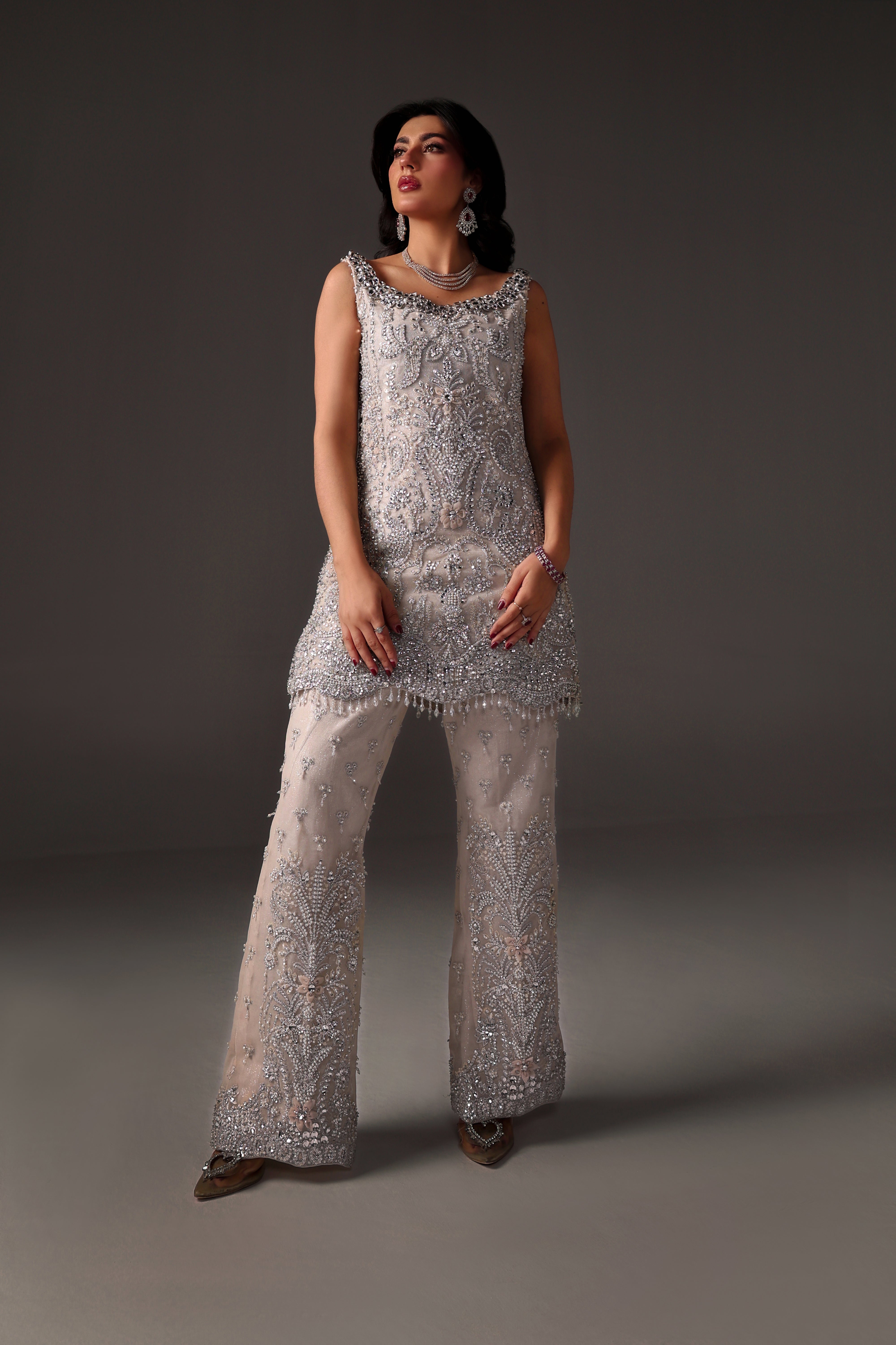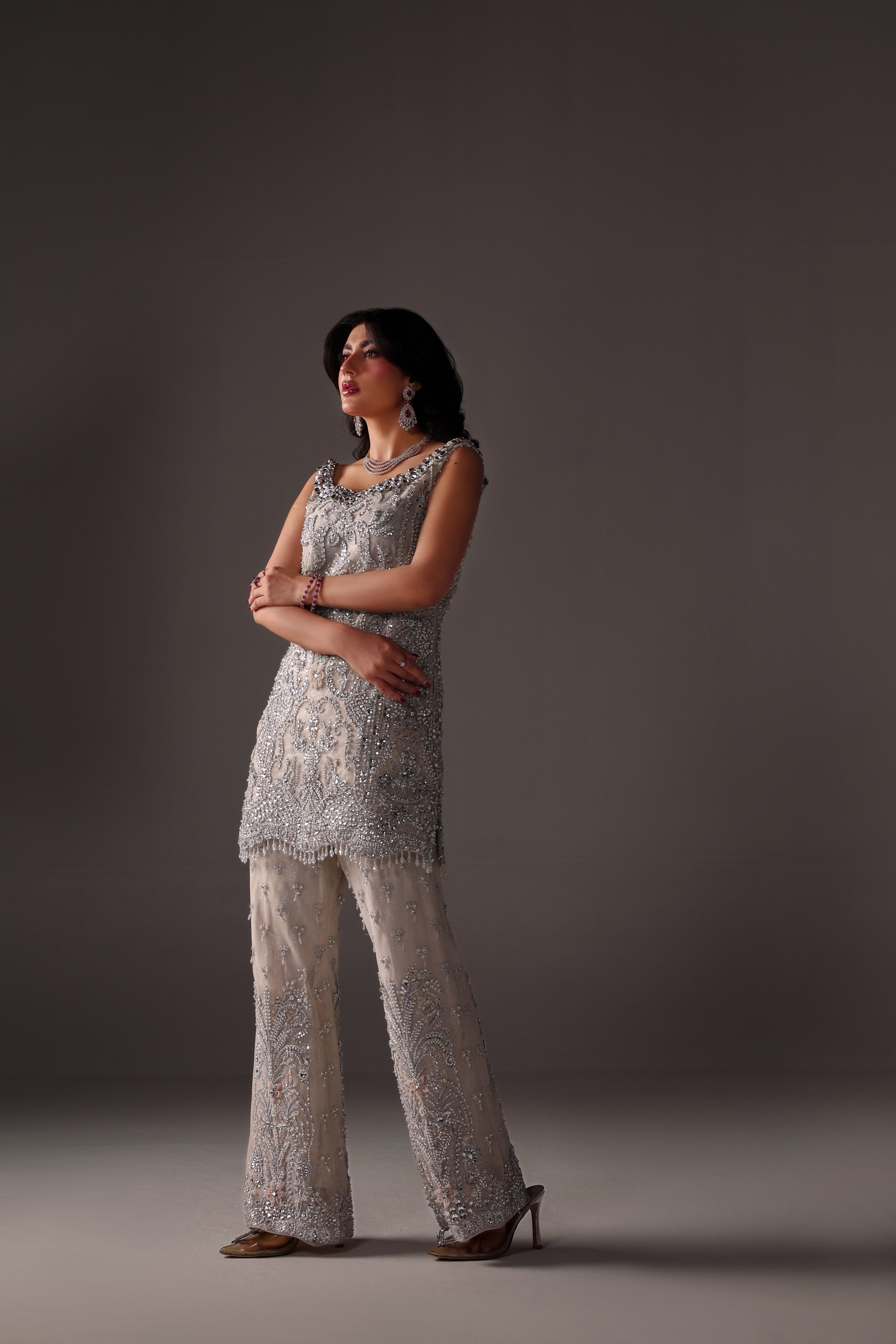 Oria is a stunningly elegant ivory formal coord set crafted on luxurious net fabric. The shirt showcases intricate embroidery with hand embellishments, crystals, Swarovski stones, and detailed beadwork, exemplifying exquisite craftsmanship. Paired with matching pants, this masterpiece delivers a sophisticated, opulent look ideal for high-end events and formal evenings.