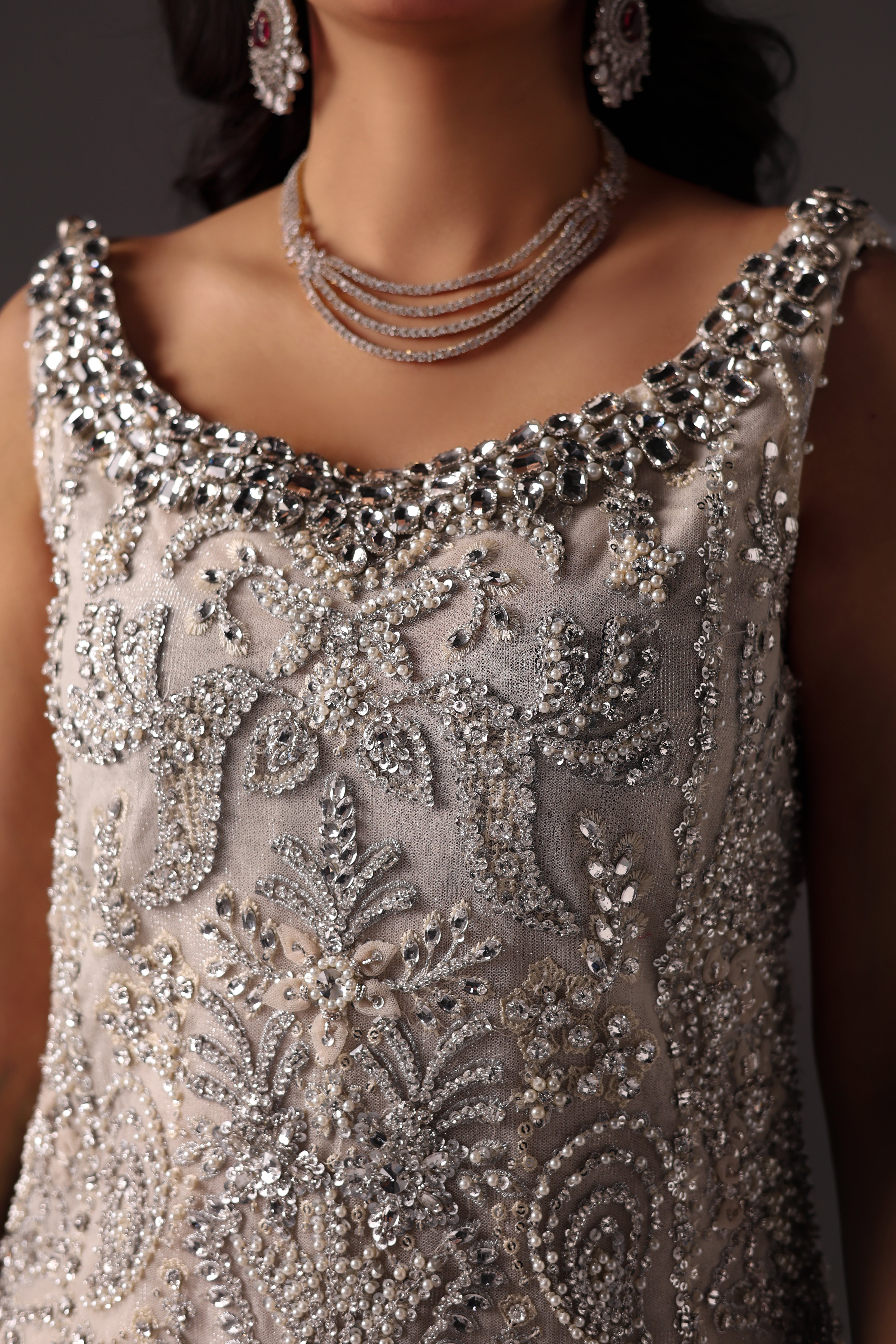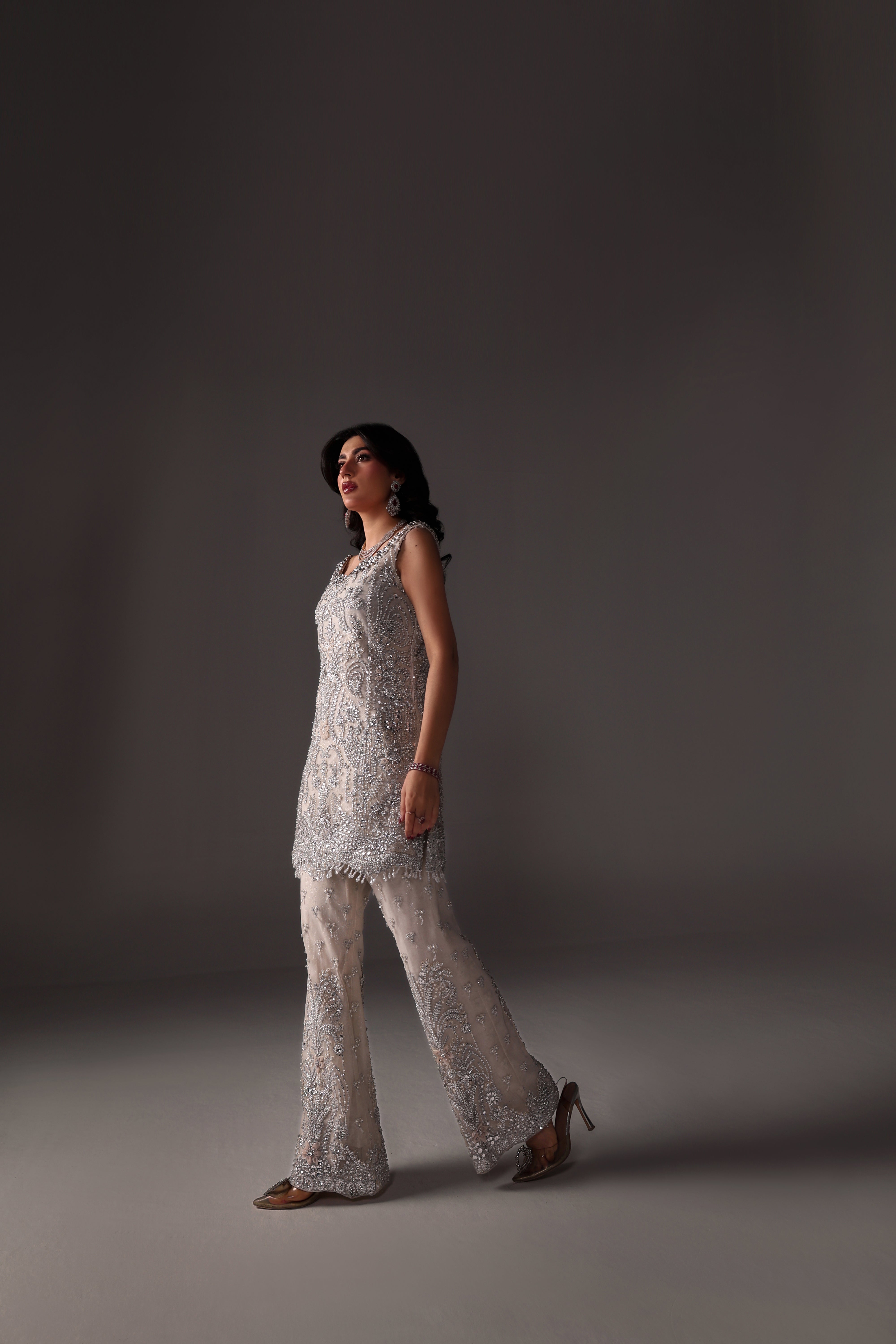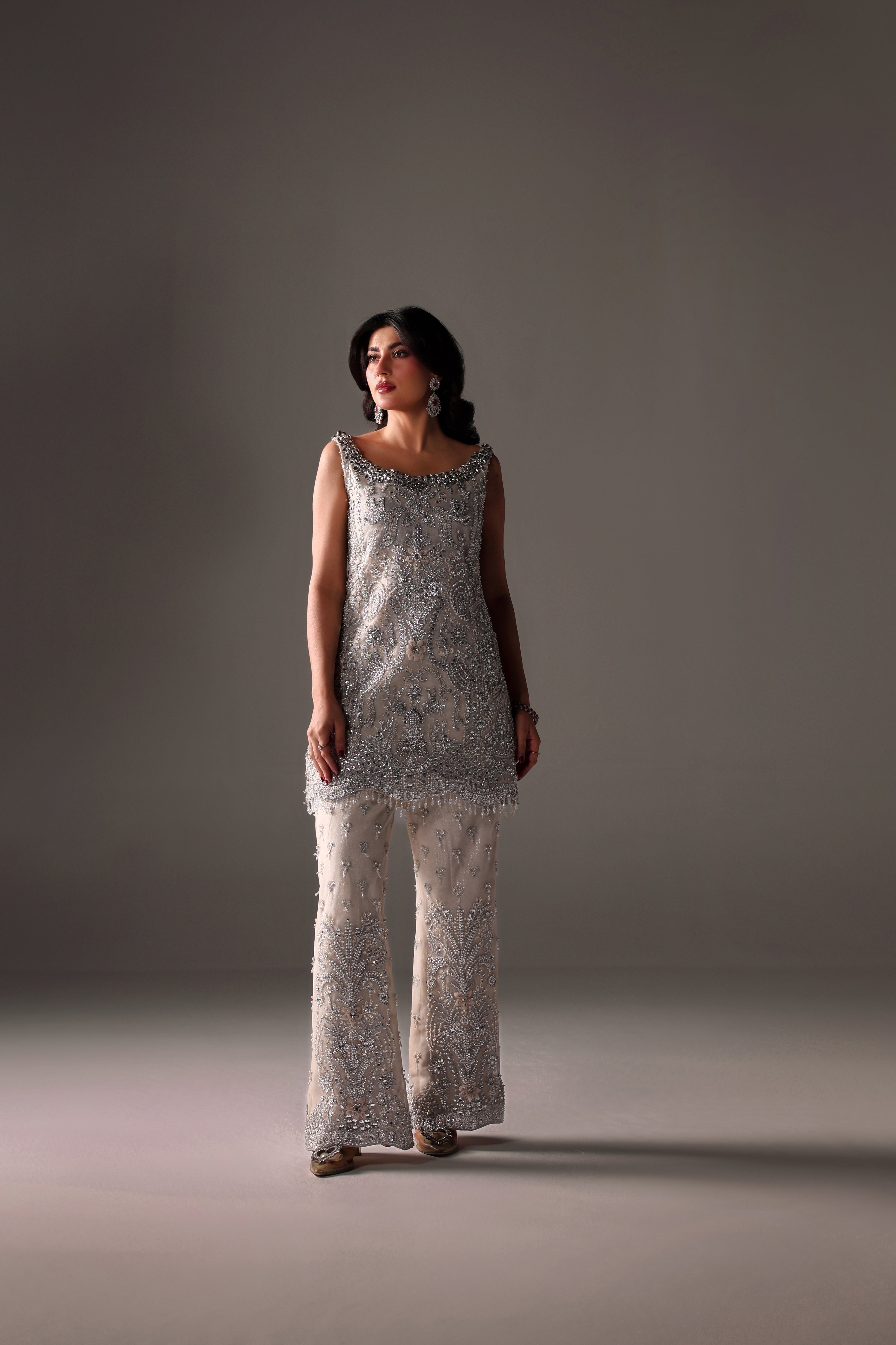 Oria is a stunningly elegant ivory formal coord set crafted on luxurious net fabric. The shirt showcases intricate embroidery with hand embellishments, crystals, Swarovski stones, and detailed beadwork, exemplifying exquisite craftsmanship. Paired with matching pants, this masterpiece delivers a sophisticated, opulent look ideal for high-end events and formal evenings.