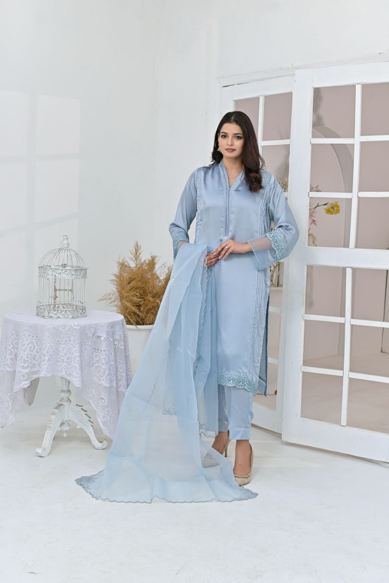 A canvas of dreamy, ice blue plates long shirt with bottom & seleves border with stunning organza totally machine embroidery & border flowers motifs. Forever stylish, irresistible details will make this one of your smartest buys this season!