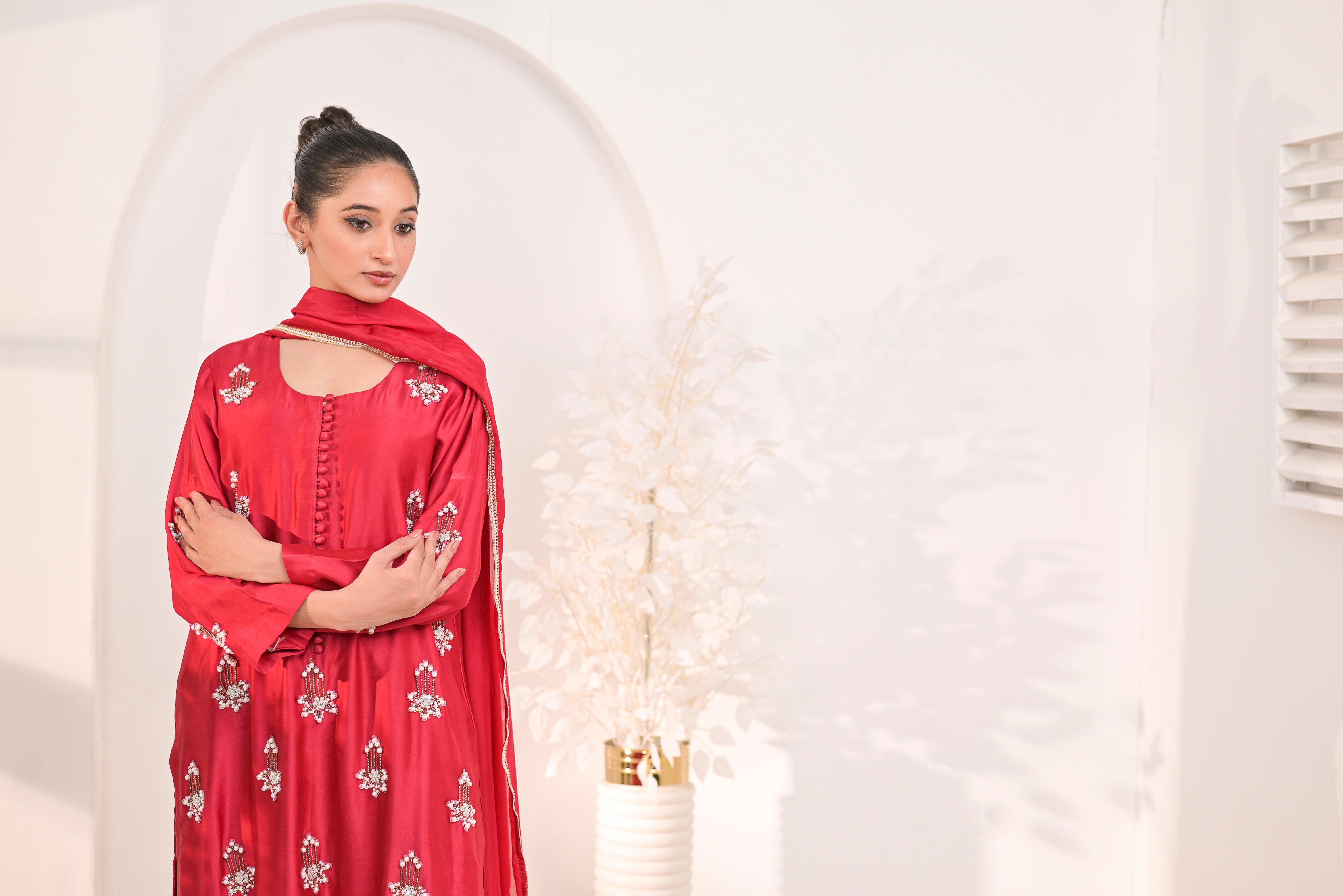 This trendy long dress features exquisite handwork with stones, sequins, silver and red detailing, and antique pearls. The buttoned neckline adds a stylish touch, while the included dupatta completes this elegant three-piece ensemble.