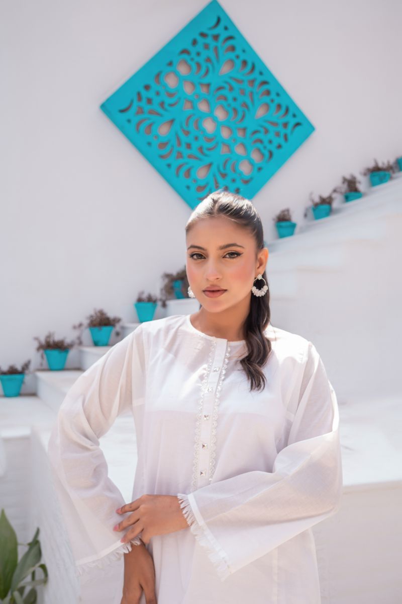 Lily features lace and bead embellishments along the neckline with fringe details on the sleeves & daman. The shirt's material is lawn, making it a breathable and an airy fabric. - Wash with cold water on a gentle cycle. - Use mild detergent; avoid bleach. - Turn inside out for printed shirts. - Air dry in shade to protect colors. - Use low heat for ironing if needed. This ensures your lawn shirts last longer! ??