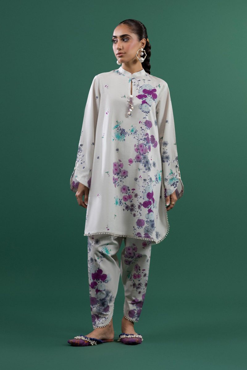 Floral Printed shirt on beige lawn base in shades of magenta and lavender color along with matching pants.