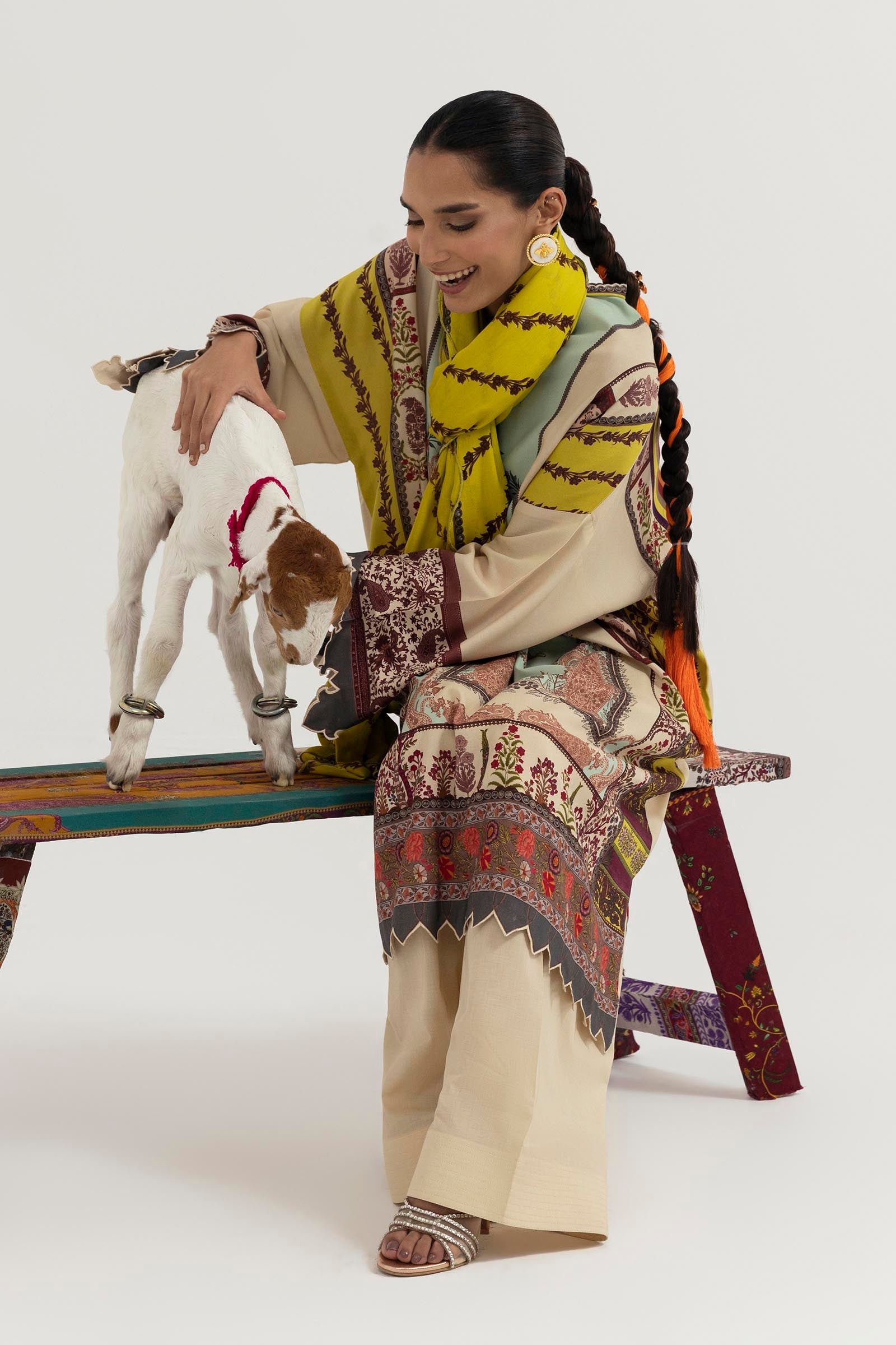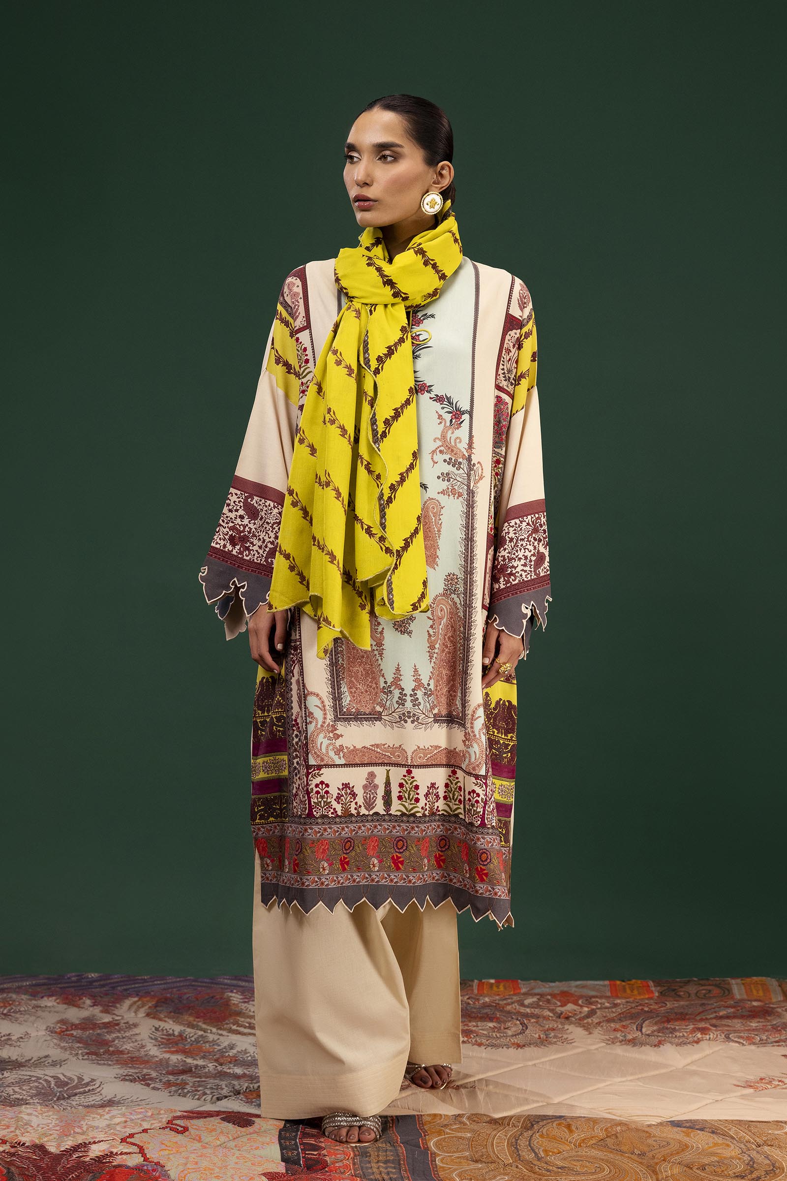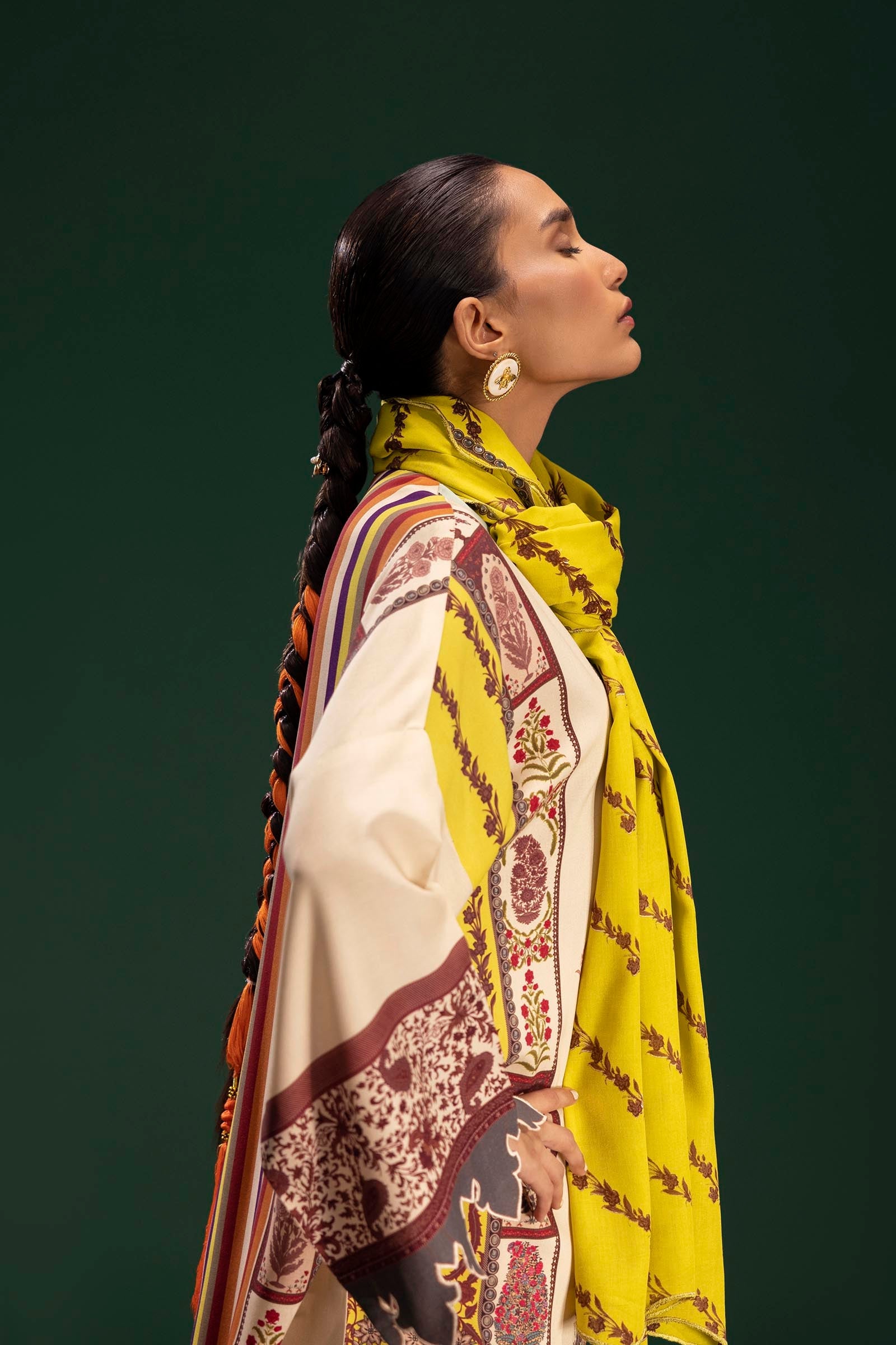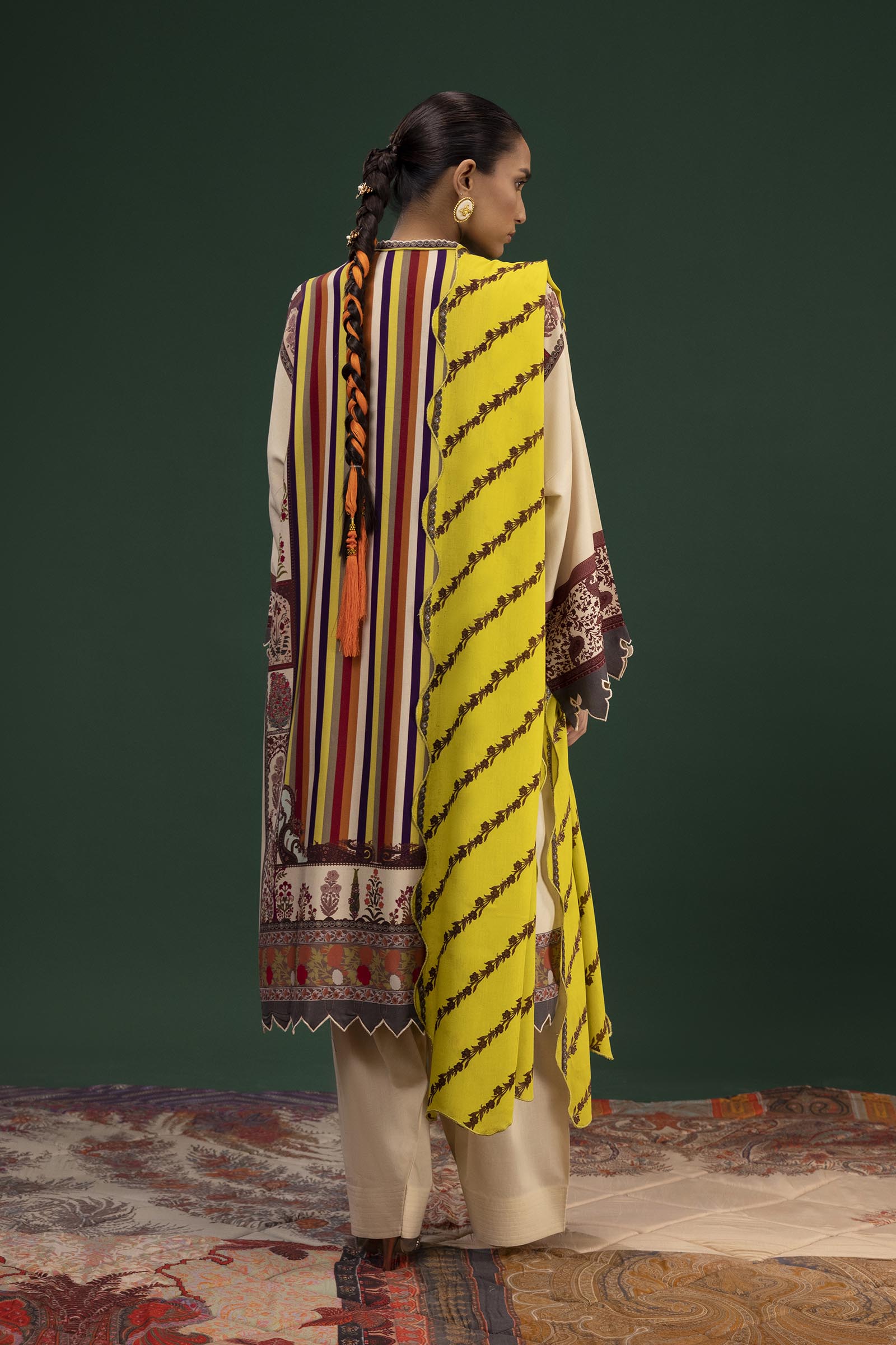 Motif-inspired digital-printed shirt in vibrant multi-colors, paired with a trellis-style diagonal stripe rotary-printed dupatta. D 07 (A) (2 Pc) • Digital Printed Shirt Front On Linen 1.15 mtr • Digital Printed Shirt Back On Linen 1.15 mtr • Digital Printed Sleeves On Linen 0.65 mtr • Rotary Printed Dupatta On Linen 2.5 mtr Indian paisley style set designed digital printed shirt on multi-color along with Trellis style diagonal stripe rotary printed dupatta.