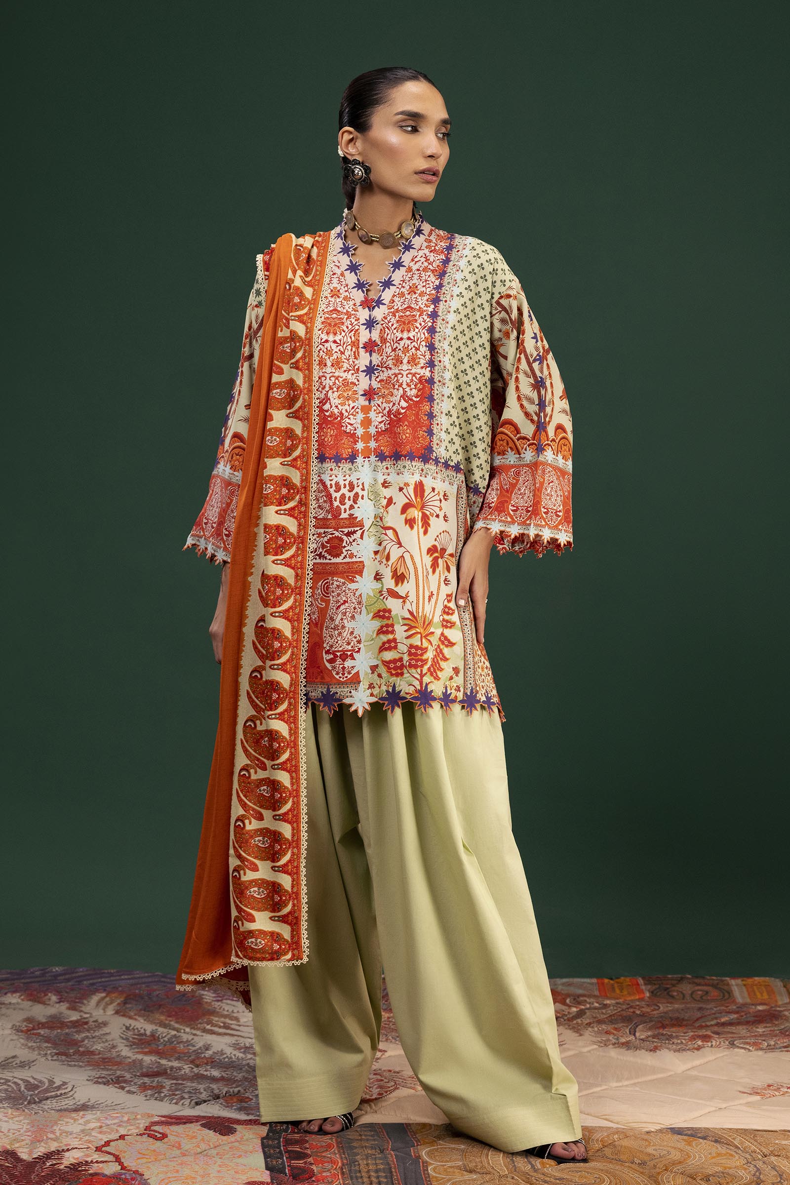 A digital-printed fusion of paisley and Mughal art in fern, sage, fire, and tangerine, paired with a paisley rotary-print dupatta and matching pants. D 03 (B) (3 Pc) • Digital Printed Shirt Front On Linen 1.15 mtr • Digital Printed Shirt Back On Linen 1.15 mtr • Digital Printed Sleeves On Linen 0.65 mtr • Rotary Printed Dupatta On Linen 2.5 mtr • Dyed Cambric Pants 1.80 mtr Fusion of Indian paisley & Mughal painting digital printed shirt in the shades of Fern Sage fire and tangerine along with Indian paisley rotary printed dupatta with matching pants.