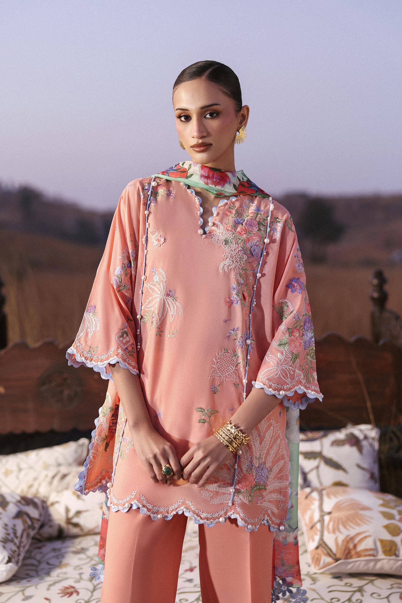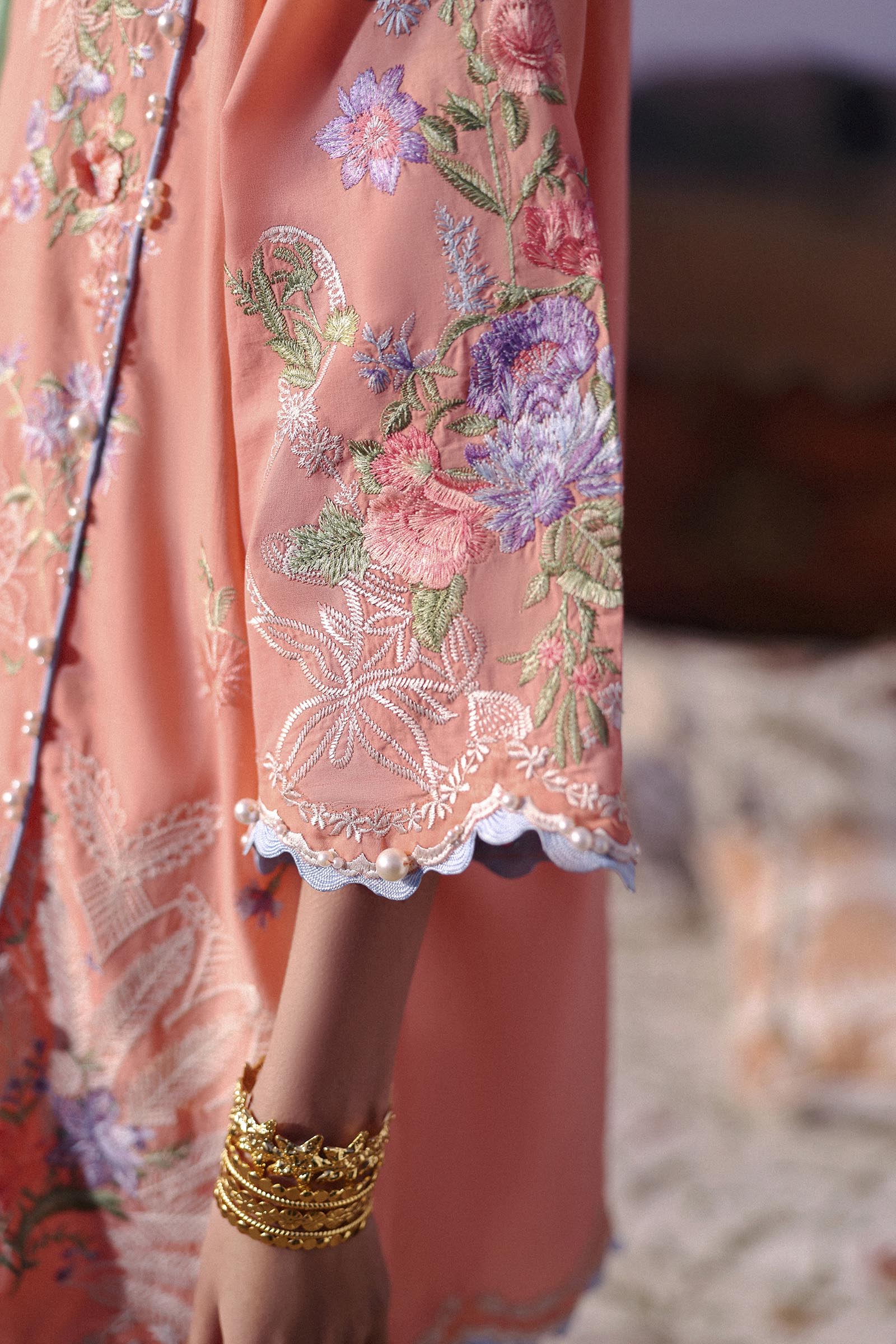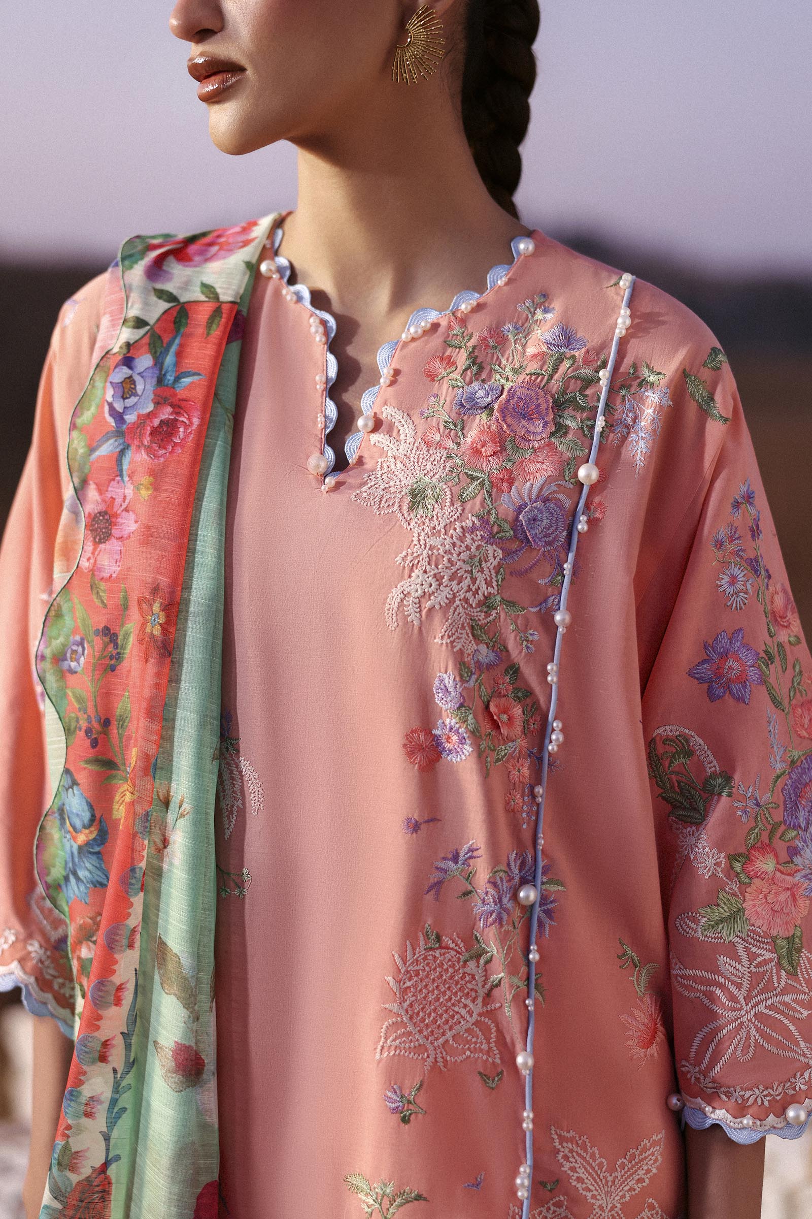 Light, breezy pastels contrasted with intricate embroidery, capturing the essence of spring romance.