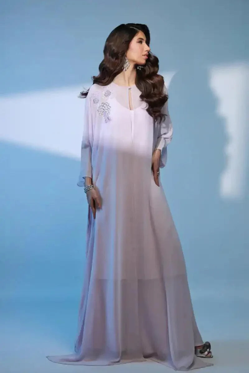 Bright. Shining. One. A lilac georgette inner shirt, wide legged lowers, and a chiffon georgette cape. Handwork in sequins, beads, and crystals.