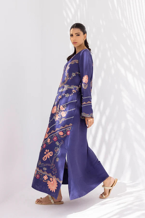 A striking midnight blue kaftan cut from pure rawsilk is embroidered with a tapestry of painterly florals in contrasting shades of peach and coral. Artfully arranged in symmetrical formations, the embellishment elevates the relaxed silhouette, which features scalloped full sleeves and a rounded neckline. Bold floral sprigs along the hem and sleeves lend a sense of movement, making this piece a standout from brunch to banquet festivities. Model height: 5'8 Length: 52 Cut: Relaxed Fit Design may vary slightly from the display images. A variation in size of +/- 2 inches is considered within an acceptable tolerance.