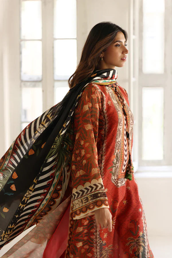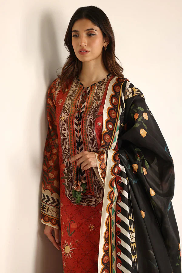 Storytelling is translated through print in this ensemble, blending burnt orange, ebony, and earthy tones into a striking tapestry of heritage and modernity. The flowing silhouette is enriched with intricate patterns inspired by nature and folklore, while a statement ebony-hued medium silk dupatta showcases playful elements on its border and magnified tropical motifs on the pallu. It is paired with matching burnt orange pure rawsilk trousers. Model height: 5'7 Length: 52 Cut: Relaxed Fit Design may vary slightly from the display images. A variation in size of +/- 2 inches is considered within an acceptable tolerance.