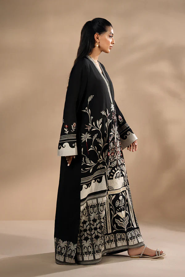 A striking ebony ensemble fuses bold artistry with timeless elegance. Cut from fluid pure rawsilk, the kaftan is brought to life with intricate ivory and scarlet embroidery and appliqué detailing. A lush tapestry of florals and foliage unfurls from the hem upward, framed by symmetrical, almost architectural embellished borders. The neckline features delicate geometric resham work, adding a subtle edge that draws the eye. Matching pure rawsilk culottes with embroidered hem complete the look that seamlessly balances tradition and modernity.
