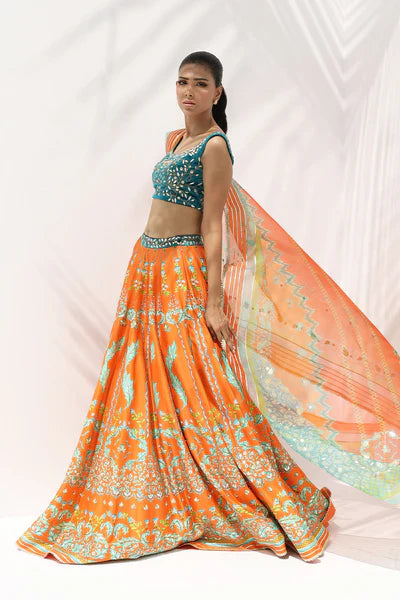 In jewel tones of teal and tangerine, this ensemble strikes a balance of artistry and finesse. The teal velvet cropped blouse is richly embroidered with gilded vines and florals, its dark surface shimmering against the light. It is paired with a flowing pure raw silk lehenga in layered tones of blue, adorned with fine gota embroidery, delicate sequins, and painterly florals that scatter across its expanse. A diaphanous organza dupatta, edged with gota and finished with tasselled accents, completes the look with refined elegance.Design may vary slightly from the display images.A variation in size of +/- 2 inches is considered within an acceptable tolerance.