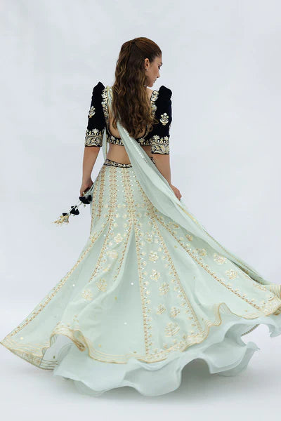 A striking interplay of midnight blue and mint, this look marries regal poise with airy grace. The cropped velvet blouse, in deep midnight blue, is sculpted with structured shoulders and delicately embellished with resham and zardoze embroidery. It pairs with a voluminous mint hued khaddi silk lehenga, layered in soft organza ruffles at the hem and embroidered with gilded rosettes, sequins, zardoze work and gota borders that catch the light with every turn. A diaphanous georgette dupatta edged in gold sequins completes the look, draping effortlessly to balance drama wih poise.Design may vary slightly from the display images.A variation in size of +/- 2 inches is considered within an acceptable tolerance.