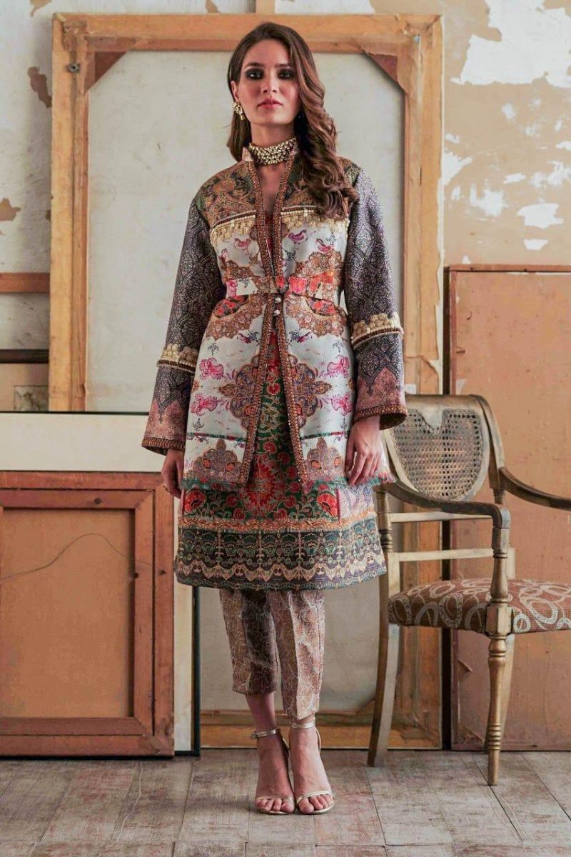 Front vertical handworked border. Gold zar intricate outlining on the front. Zardozi and sequins embellishments. Intricate gold outlining on the border.