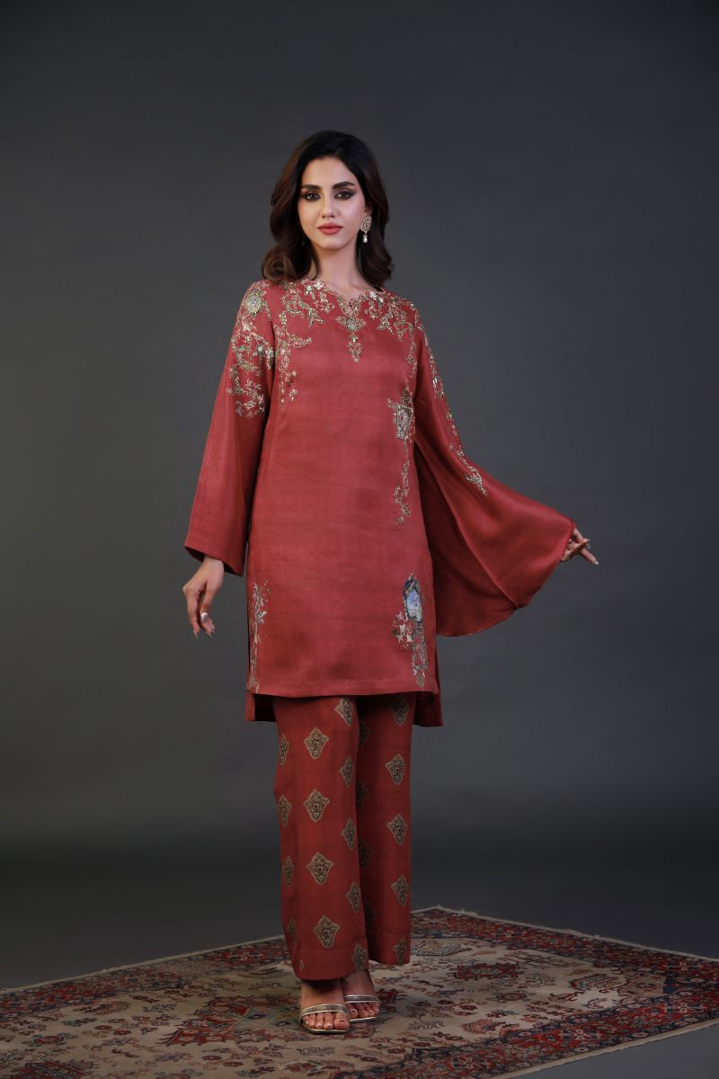 This bold and elegant red ensemble is a perfect blend of contemporary style and traditional craftsmanship. The statement top features a relaxed silhouette with dramatic wide sleeves, adorned with intricate gold embroidery and delicate embellishments. The regal motifs and hand-stitched details enhance the luxurious appeal of the outfit. Paired with tailored straight pants featuring geometric gold patterns, this ensemble exudes sophistication and charm. The rich red hue makes it an ideal choice for festive occasions, evening soirees, and formal gatherings. Style it with statement accessories for a truly glamorous look.