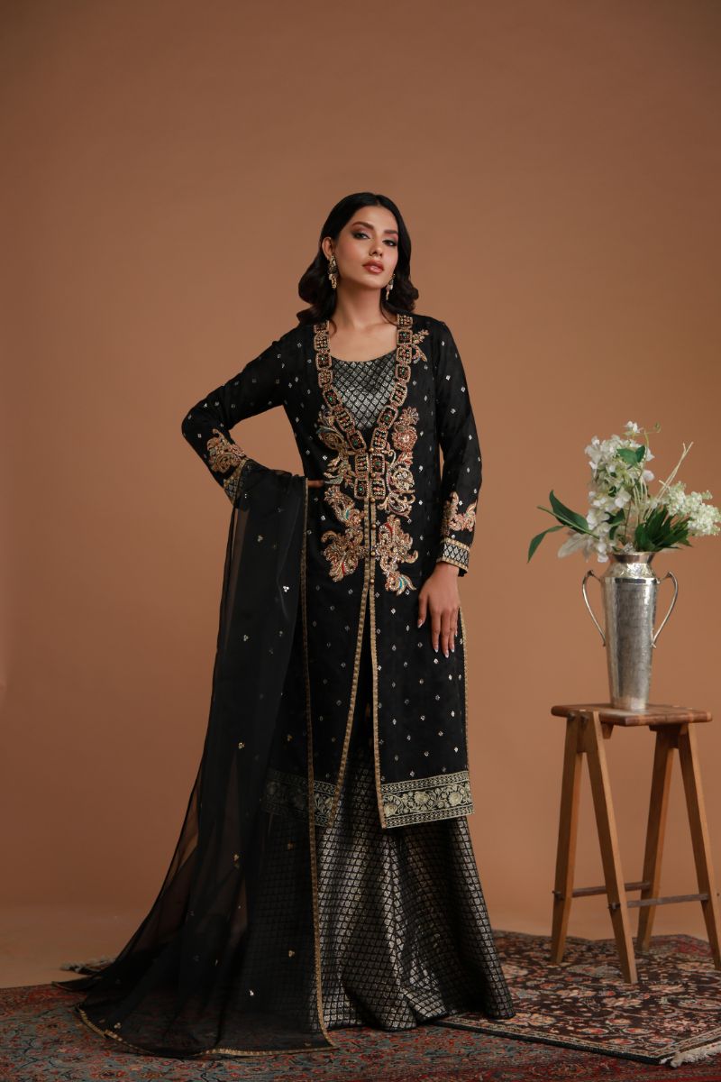 This striking black ensemble radiates regal elegance with its intricate gold and multicolored heavy embroidery adorning beaitifully on the neckline, sleeves, and hem. The long, open-front jacket is embellished with delicate motifs, while the rich jamavar inner dress adds depth and luxury. The sheer, embroidered dupatta, this outfit is a perfect blend of traditional craftsmanship and contemporary sophistication, ideal for festive and formal occasions.