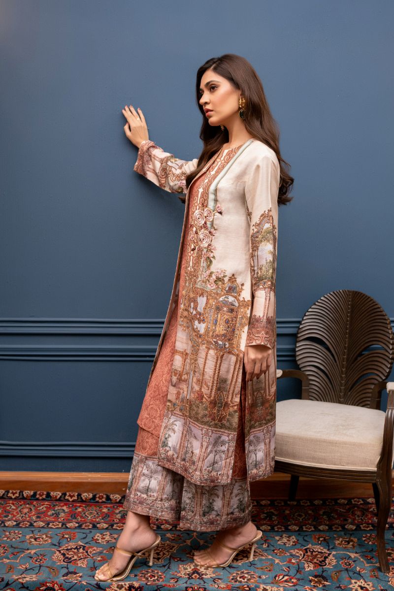 Stunning shirt inner and pant set on exquisite printed silk fabric, elevated with intricate embroidery details. Perfect for making a statement at any occasion! Shirt Fabric: Khaddi Silk Pant Fabric: Khaddi Silk