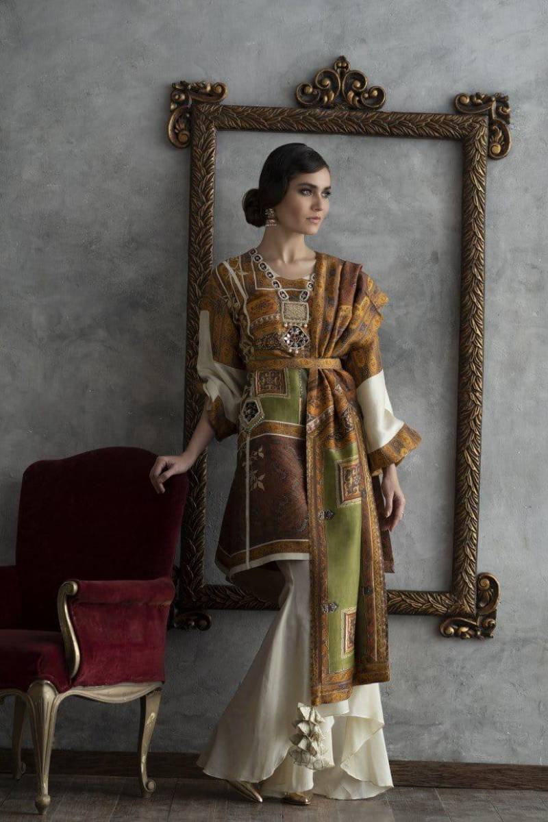 Pure silk tunic printed with a combination of Kashmiri and Ajami print. Traditional necklace and bunches paired with a digitally printed shawl in pure silk with silk backing, accessories edging on two corners of the stole.