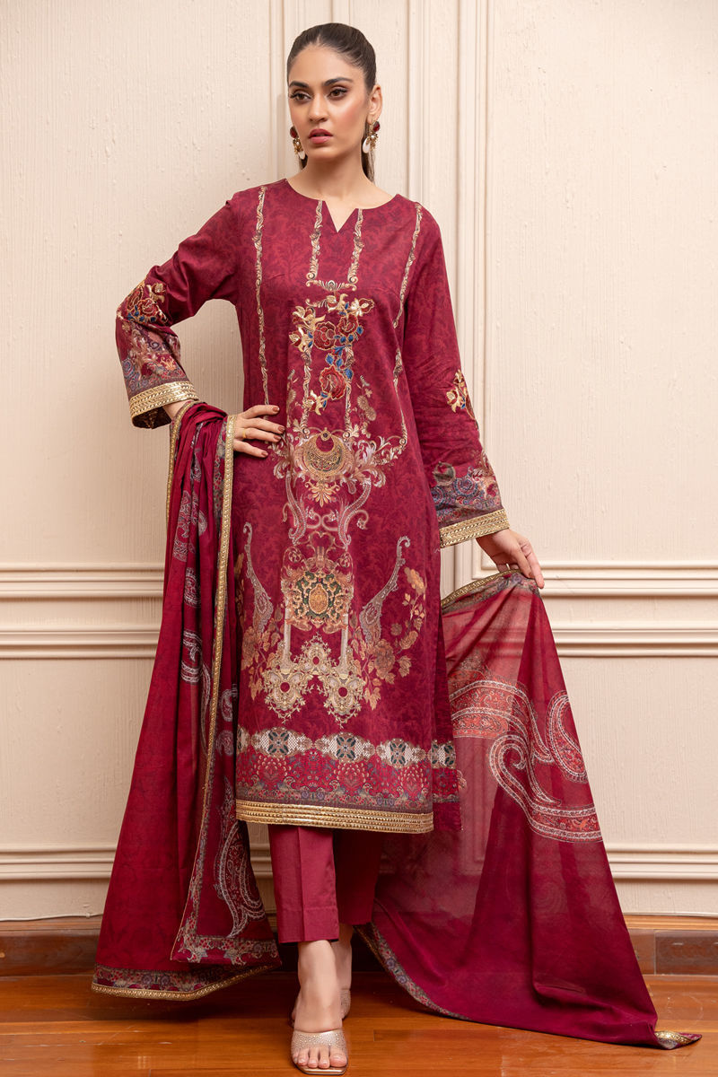 The digitally printed lawn shirt in shades of red with an embroidered bunch and tilla outline will add a beautiful visual interest, while the solid pant will provide a clean and sleek base. The printed dupatta will add a pop of color and pattern, completing the outfit with a stylish flourish.