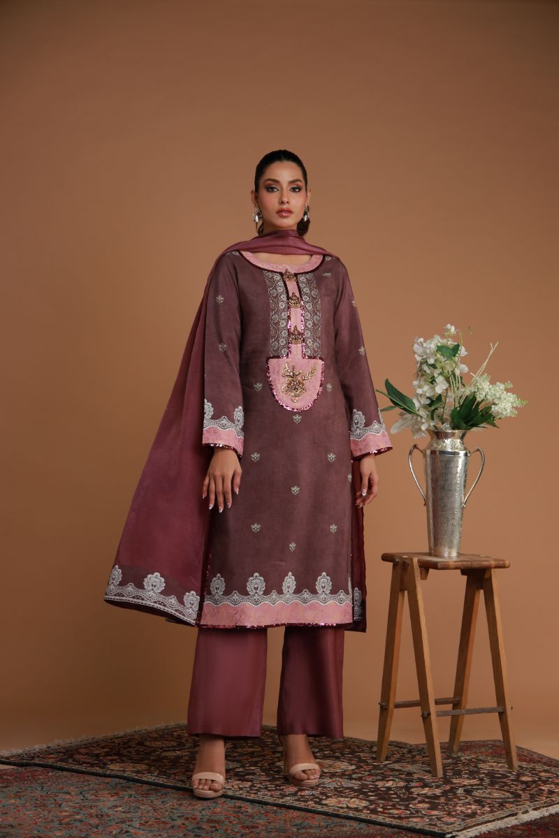 This mid-length outfit beautifully blends traditional craftsmanship with modern elegance. The hand-embroidered motif on the neck features intricate patterns, adding sophistication, while a delicate floral print enhances its romantic charm. A sequin finish on the sides, neck, and hem lends a luxurious, glamorous touch. Wide-leg pants complement the outfit’s intricate details with a flowing silhouette, and a matching dupatta with floral accents completes the ensemble with elegance. Perfect for formal events, weddings, or special occasions, this outfit is a timeless fusion of heritage and contemporary style
