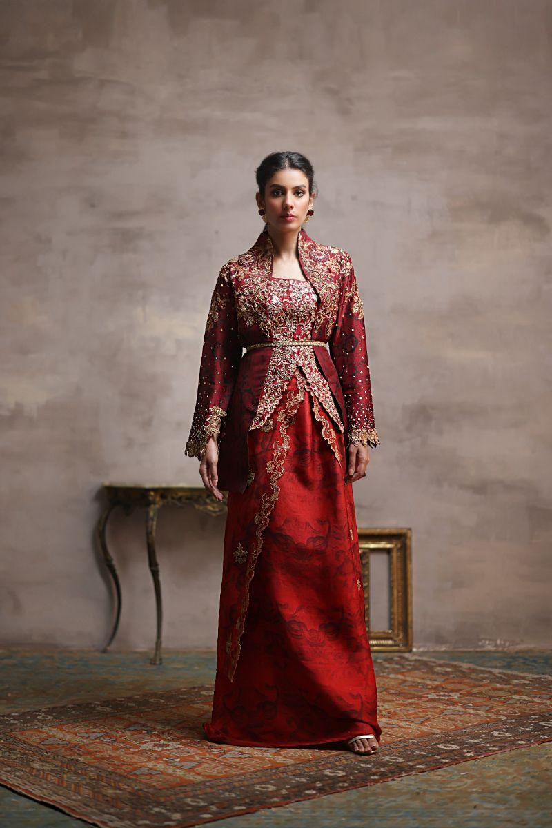 This ensemble features a rich dark maroon Seesha silk fabric with an intricate printed texture. The printed jacket boasts a golden outline and is adorned with resham thread work, further enhanced by hand zardozi detailing. The fitted inner is beautifully crafted with machine embroidered tila jaal, also embellished with zardozi work. Completing the look is a long layered skirt finished with a printed scalloped border, adding an elegant touch to the overall ensemble.