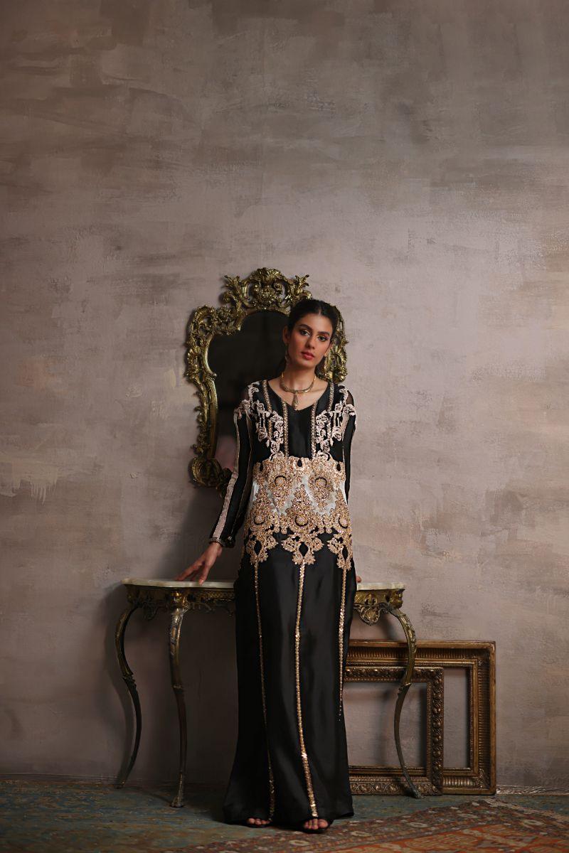 "This stunning black dress is a masterpiece of elegance, showcasing exquisite Doris work and sequins, intricately embellished with cut dana details. The sleeves feature delicate organza accents, while the body is meticulously hand-embellished with intricate cut dalana details, creating a truly regal effect. This floor-sweeping gown exudes sophistication and glamour, perfectly capturing the essence of festive splendor. Its expertly crafted adornments and luxurious fabrics will undoubtedly make you feel like a vision of beauty and poise."