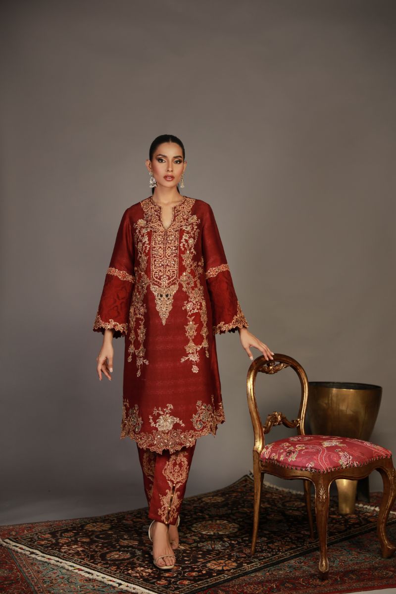 Kurta Cut in shamaeels signature print in gold tila outline, Hand touched in nakshi, dabka, sequence in gold Enhanced by using pearls and antique moti. It is paired with a straight embrodiered pant. Fabric Shirt: Sheesha Silk Fabric Pant: Khaddi Silk