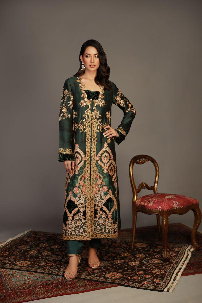 This stunning Sheesha silk Shirt paired with complimentary pants features an Ottoman-inspired print with antique gold tila embroidery and zardozi details. Dark green palachi appliqué adds richness, while the green net dupatta with tila lace completes the look. Dupatta can be added separately Fabric Shirt : Sheesha Silk Fabric Pant : Khaddi Silk Fabric Dupatta: Net