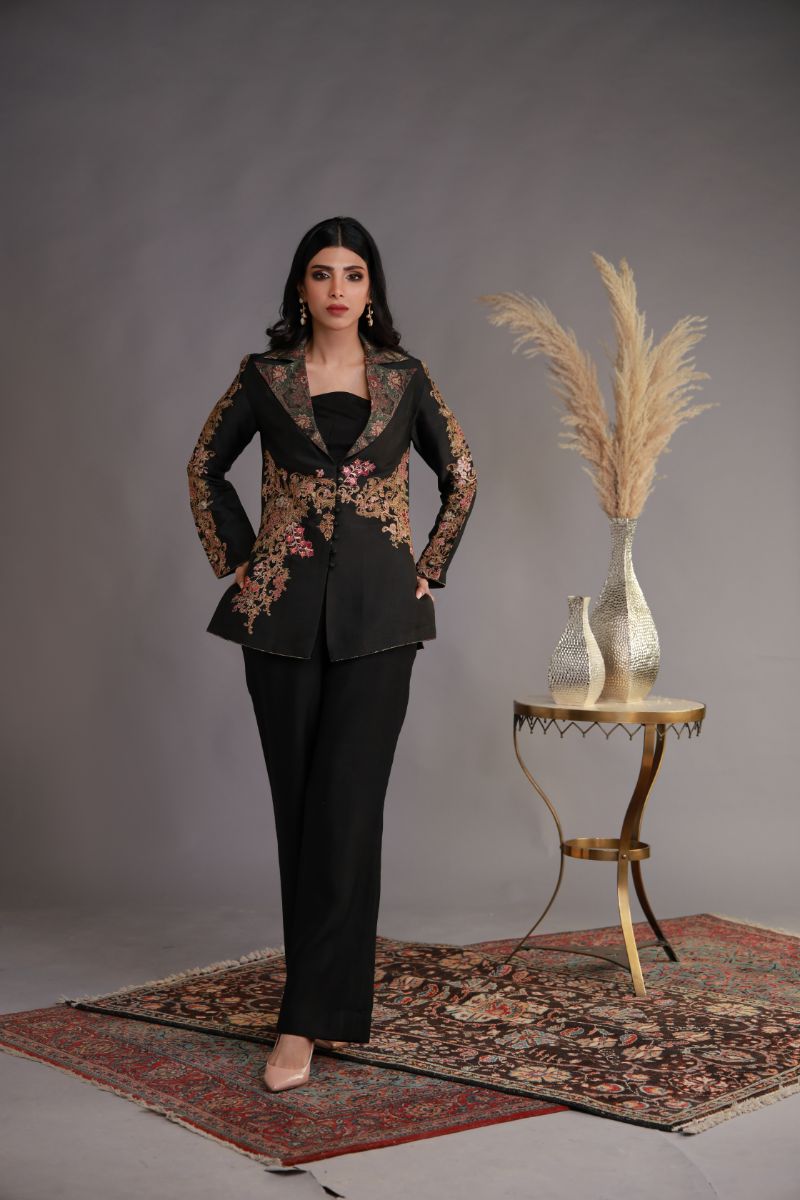 he outfit consists of a chic, tailored black pantsuit adorned with intricate floral embroidery. The jacket features a structured design with a lapel collar, enhanced by colorful and detailed floral patterns in shades of pink, gold, and green. The embroidery adds a luxurious touch, complementing the sleek, minimalistic black trousers that offer a clean and elongated silhouette. This ensemble blends traditional decorative elements with modern tailoring, making it both sophisticated and versatile for formal occasions.