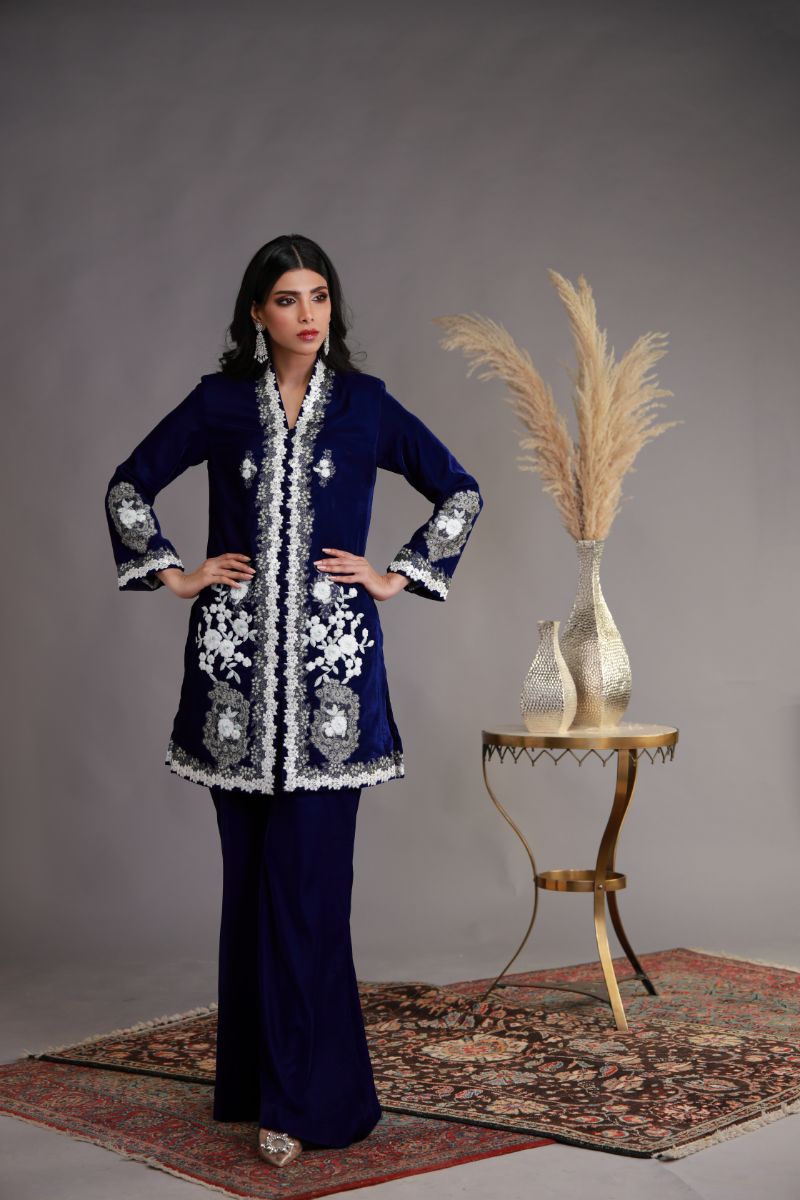 This outfit is a deep royal blue velvet ensemble featuring exquisite white floral embroidery that adds elegance and contrast. The long kurta is adorned with intricate embellishments along the front and hemline, framed by a delicate white border that highlights its rich texture. The full-length sleeves mirror the embroidered detailing, enhancing the overall regal look. It is paired with matching flared trousers, maintaining a cohesive aesthetic. The luxurious fabric and sophisticated design make it ideal for formal occasions, exuding both grace and opulence.