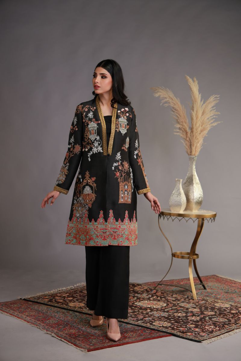 This outfit is a sophisticated black ensemble featuring vibrant multi-colored embroidery inspired by architectural and floral motifs. The kurta is adorned with intricate detailing on the front, sleeves, and hemline, highlighted by accents of gold, red, and green. The neckline is elegantly finished with a gold embellishment, adding a touch of luxury. The design transitions into an ornate border at the hem, creating a striking visual contrast. Paired with solid black straight trousers, this ensemble is a perfect blend of tradition and modern elegance, making it suitable for festive or formal events.