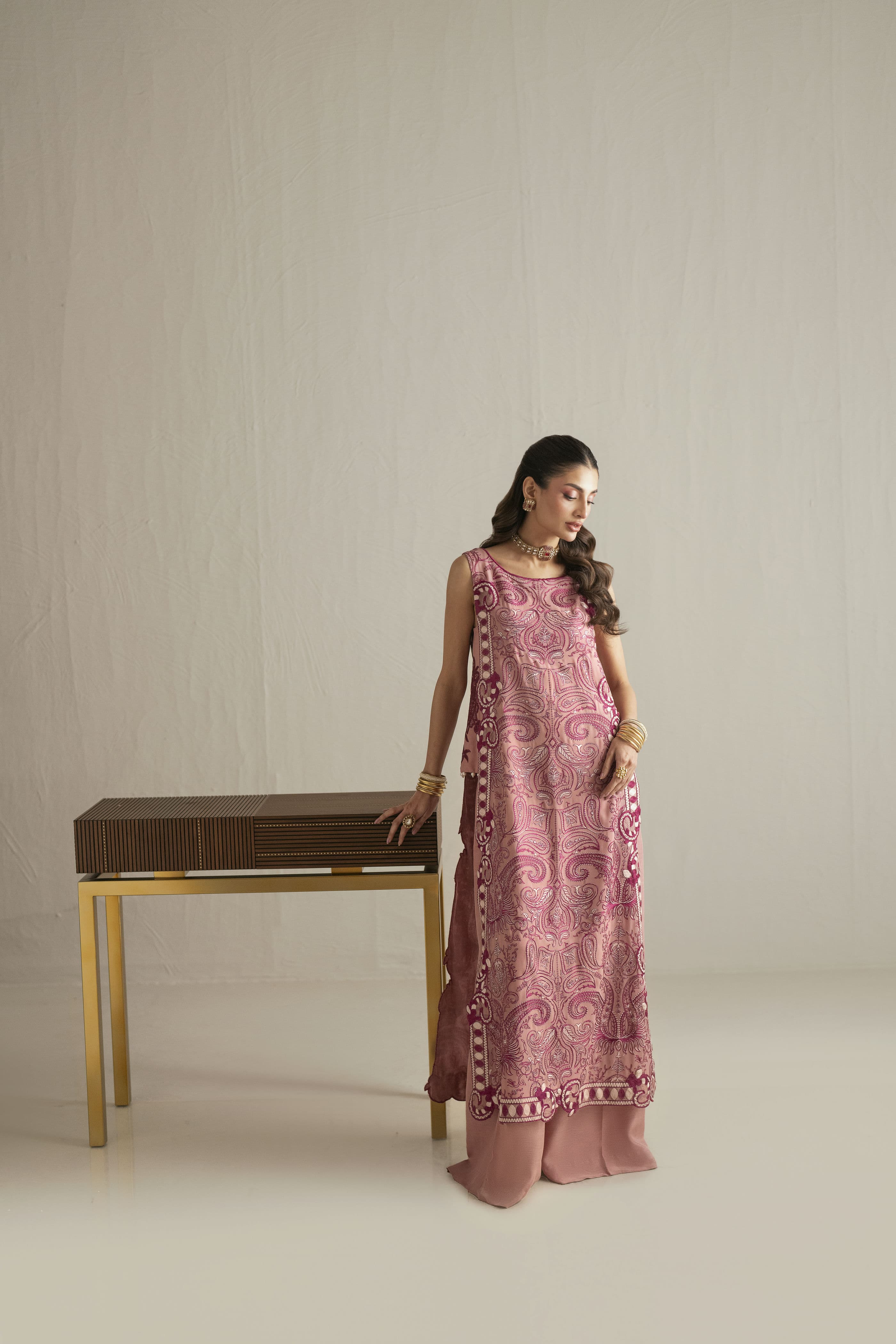 Crafted in airy chiffon, this tea pink shirt is adorned with intricate plum and off-white embroidery and styled with a statement side-carry bunch silhouette, complemented by coordinated flared palazzos.