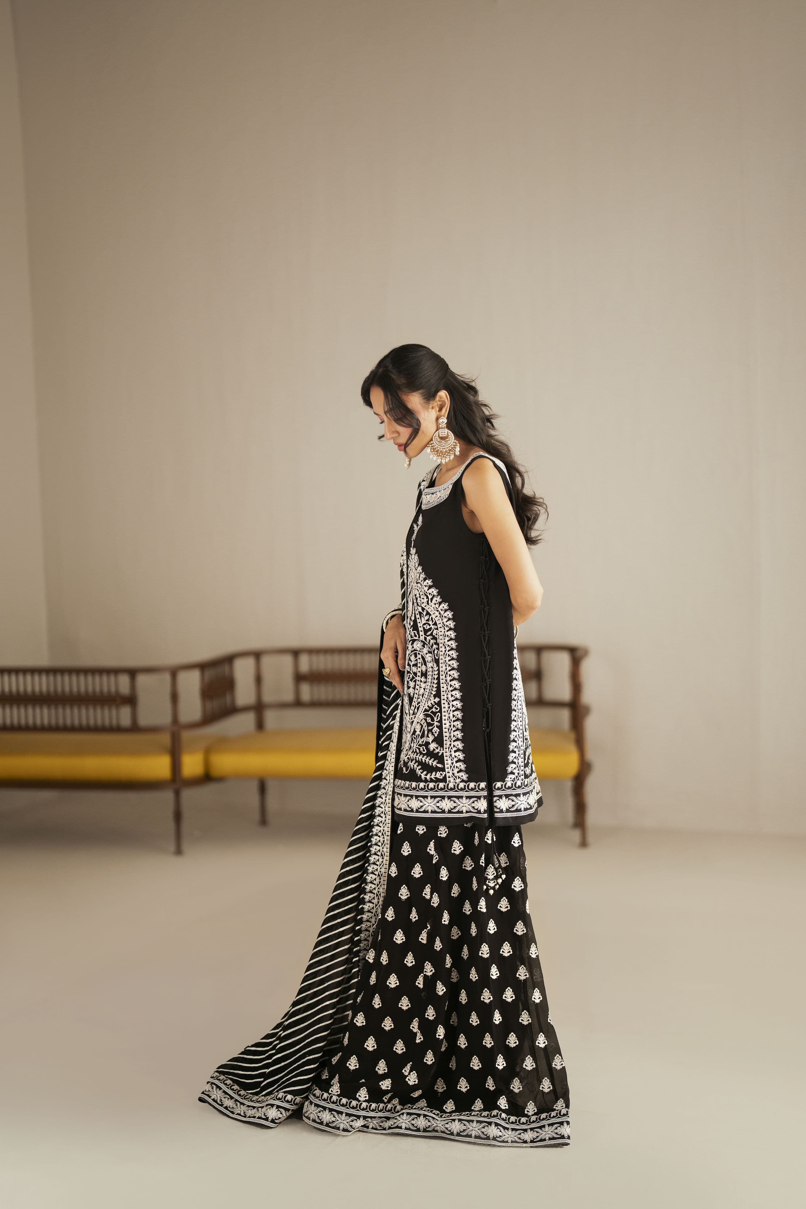 A black chiffon shirt adorned with exquisite white embroidery and elegant side dori detailing, paired with a coordinated Dhaka and chiffon dupatta featuring block prints and fine embroidery.