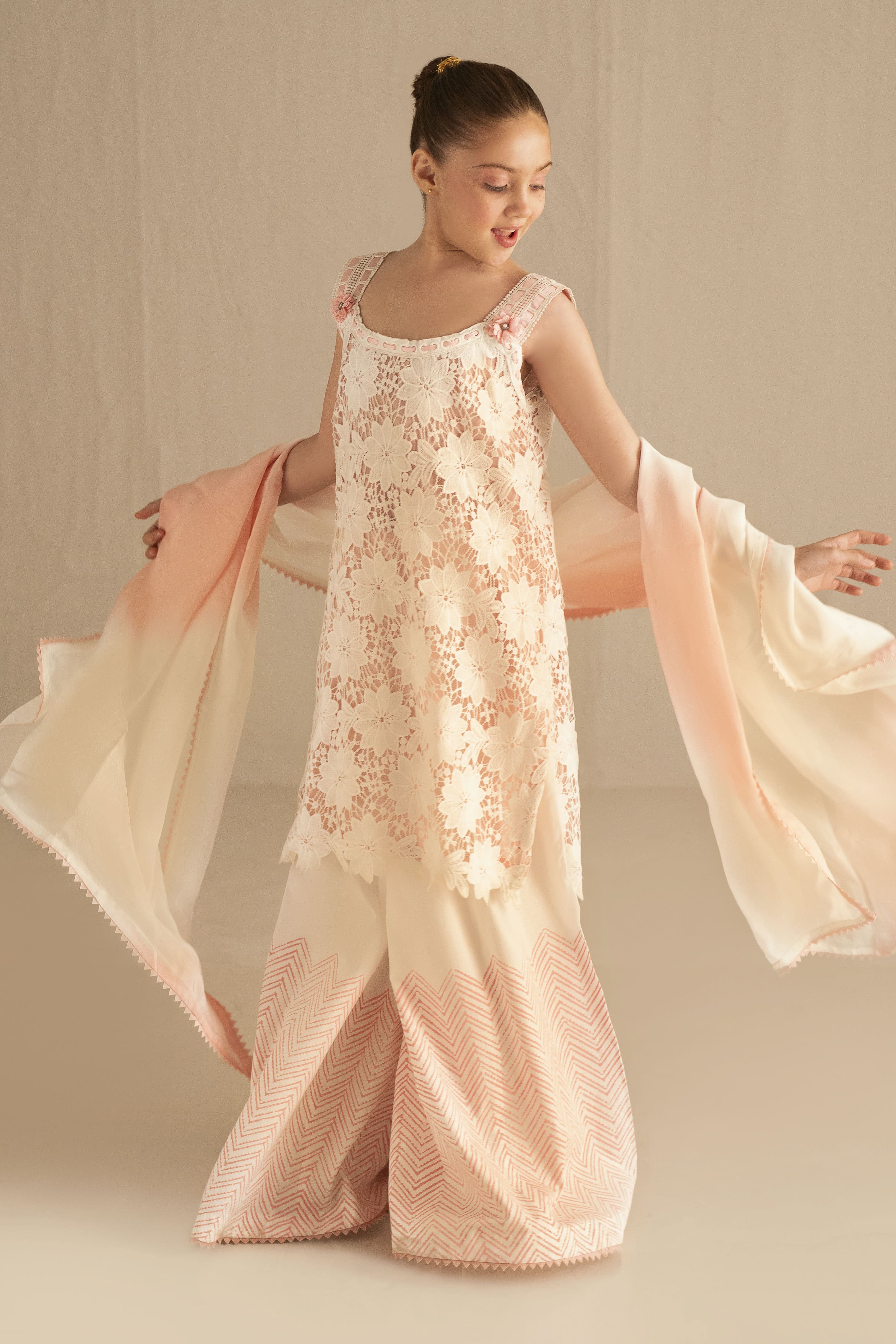 Shehrnaz - Chikan / Cotton Ivory Stripe & Blossom Set For Girl - White