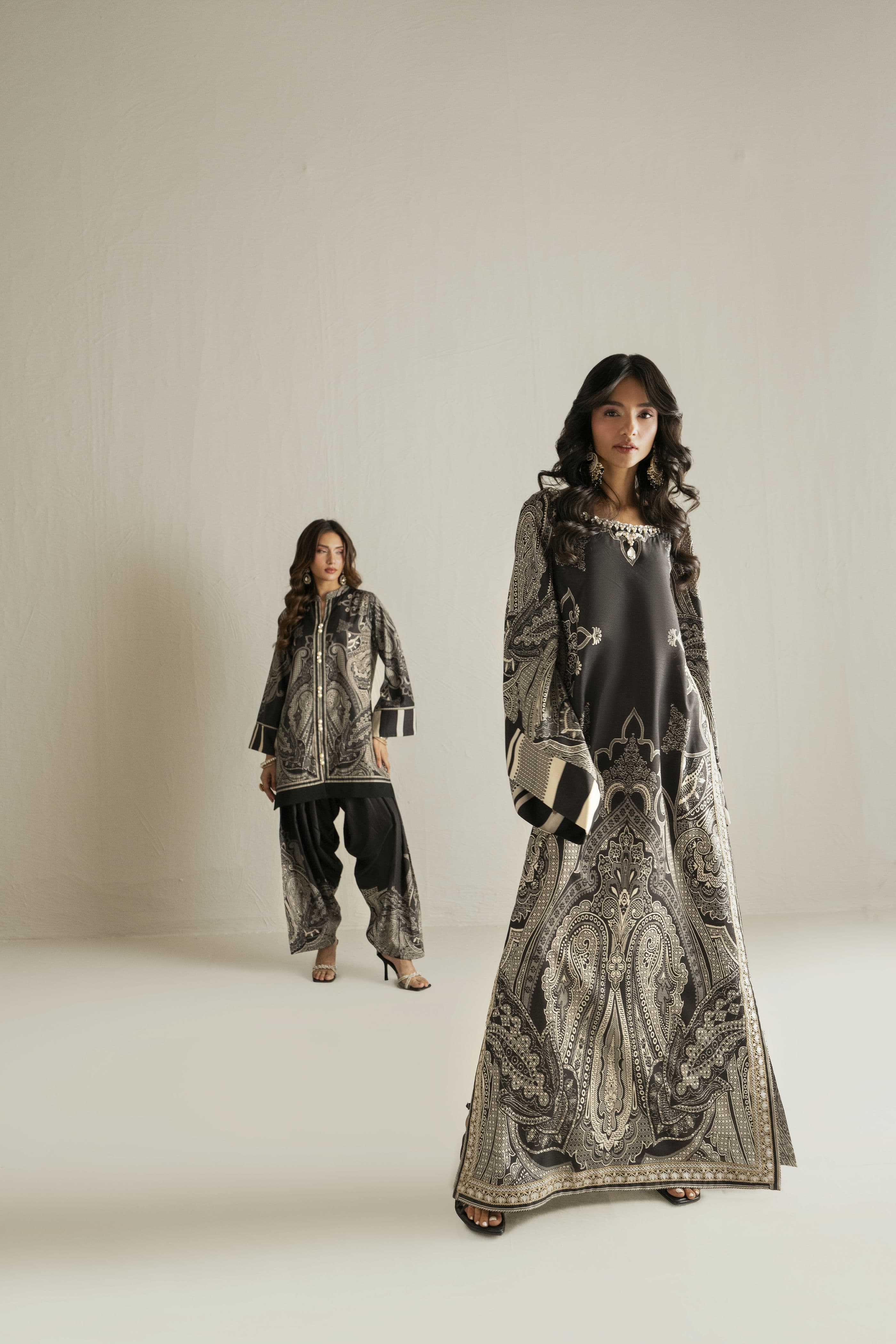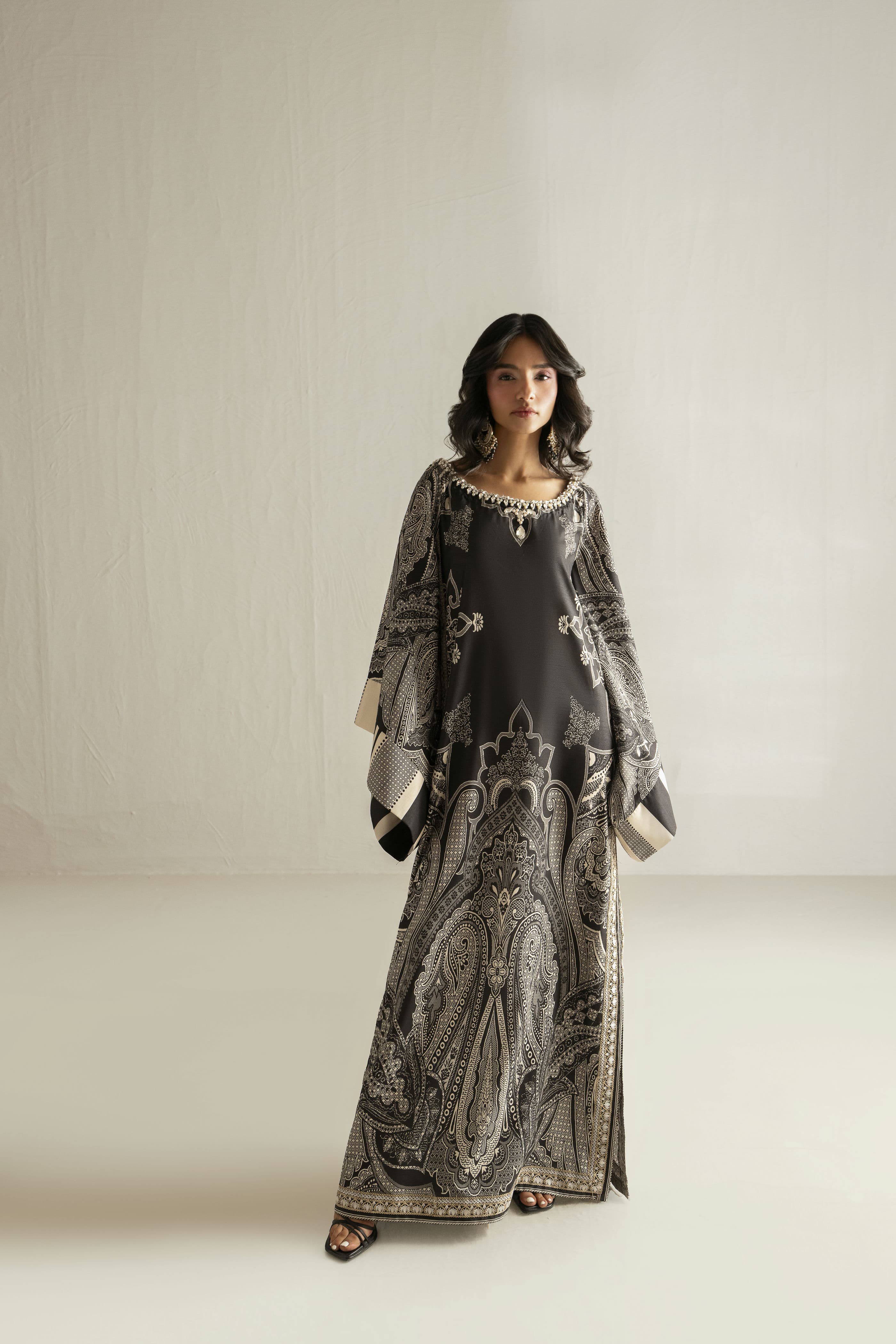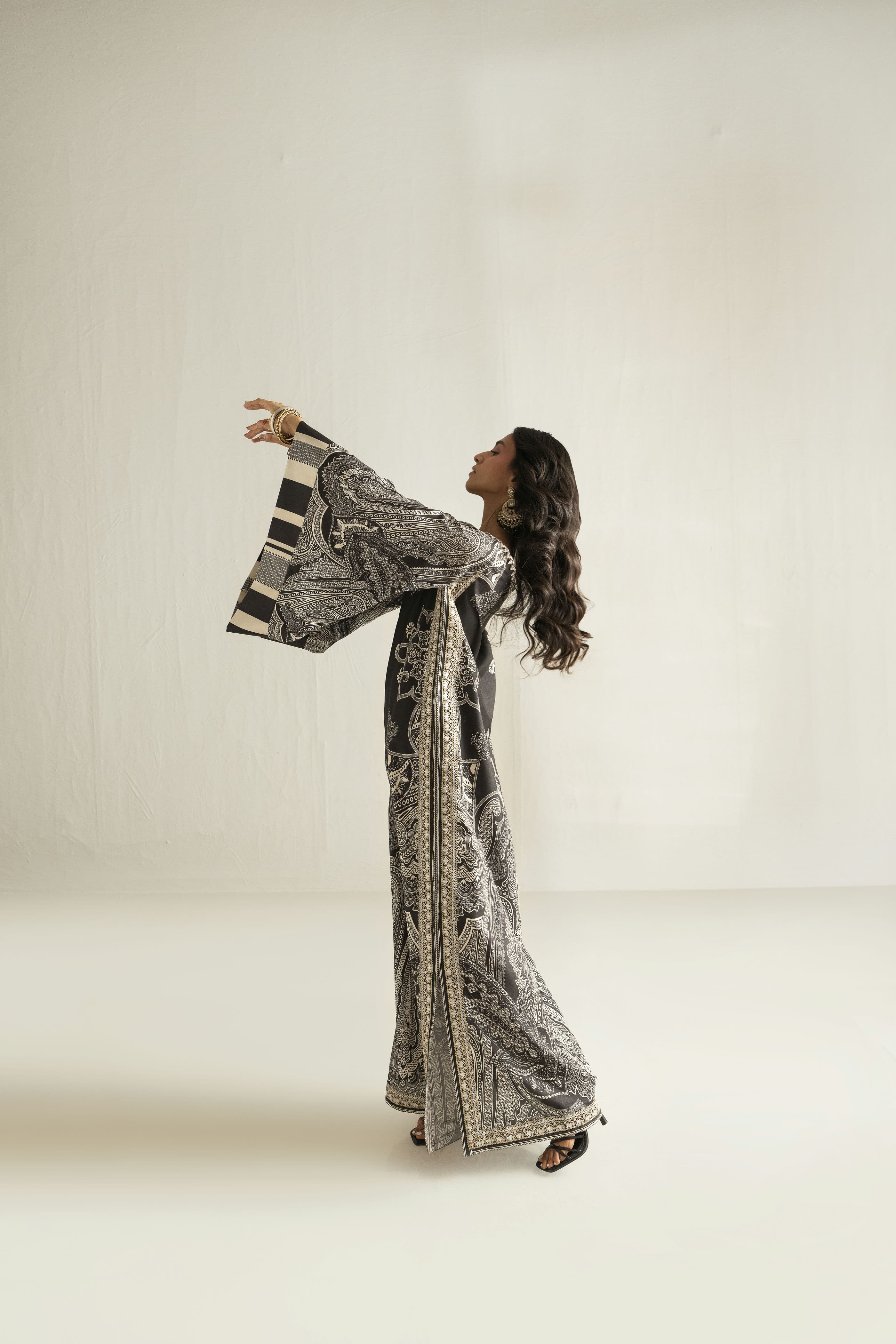 A full-length black crepe silk kaftan adorned with refined digital prints and subtle silver detailing for an effortlessly glamorous look.