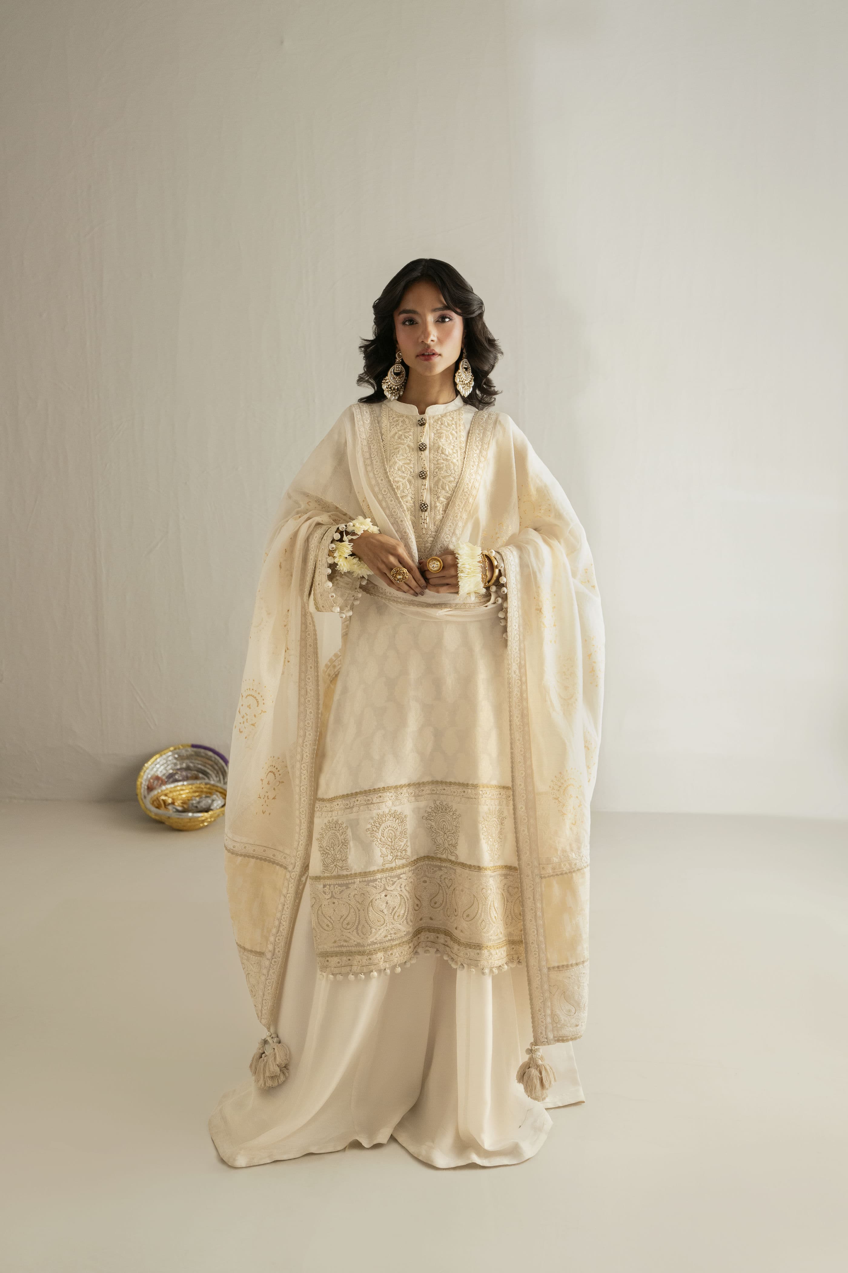 An off-white dakhai shirt adorned with refined embroidery, paired with a matching dhaka and a delicately embroidered khaadi net dupatta for a graceful festive look.
