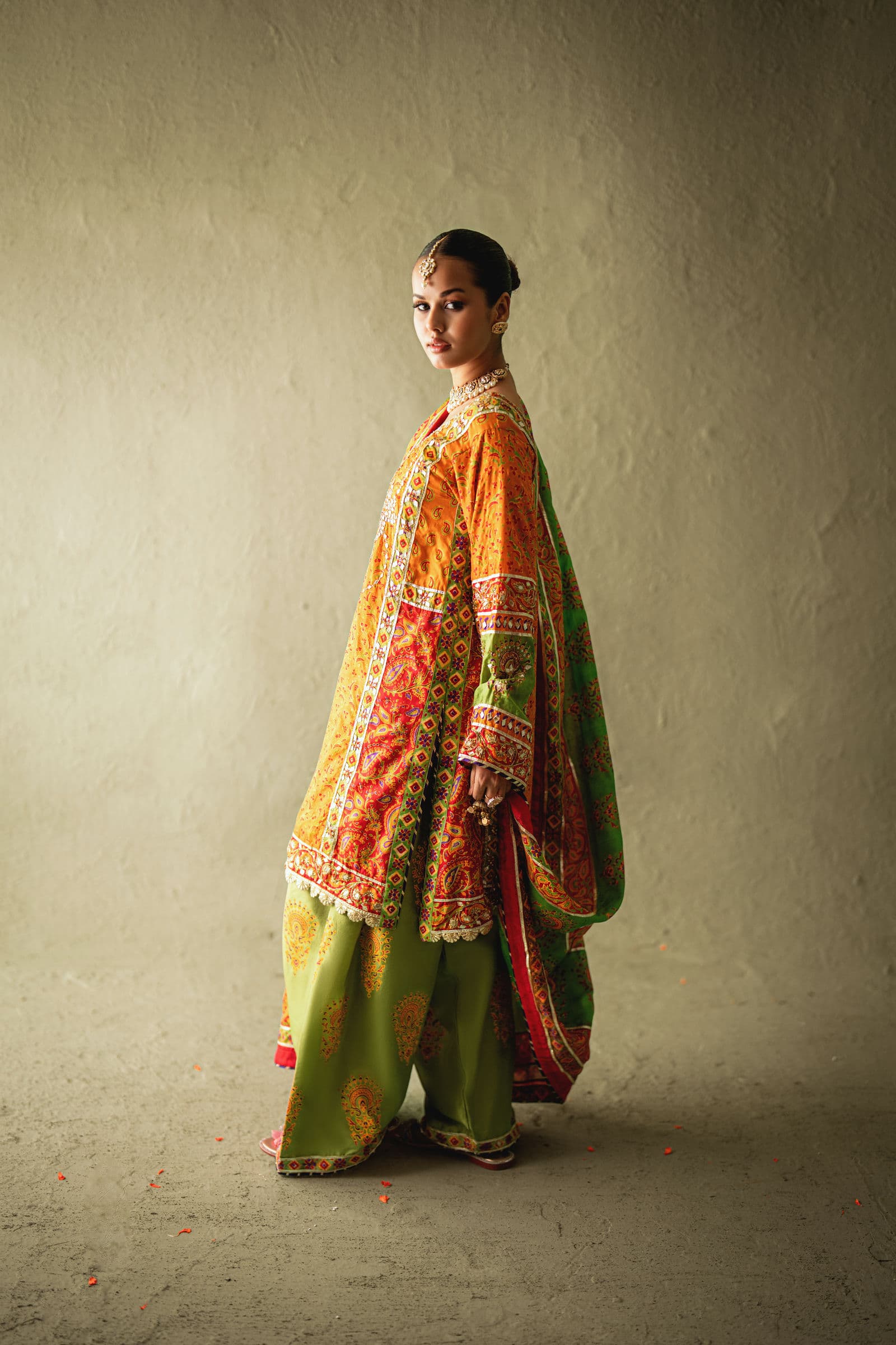 Orange & red pure silk block print gotta detailing shirt with pure Raw silk block print Shalwar & Silk block print dupatta