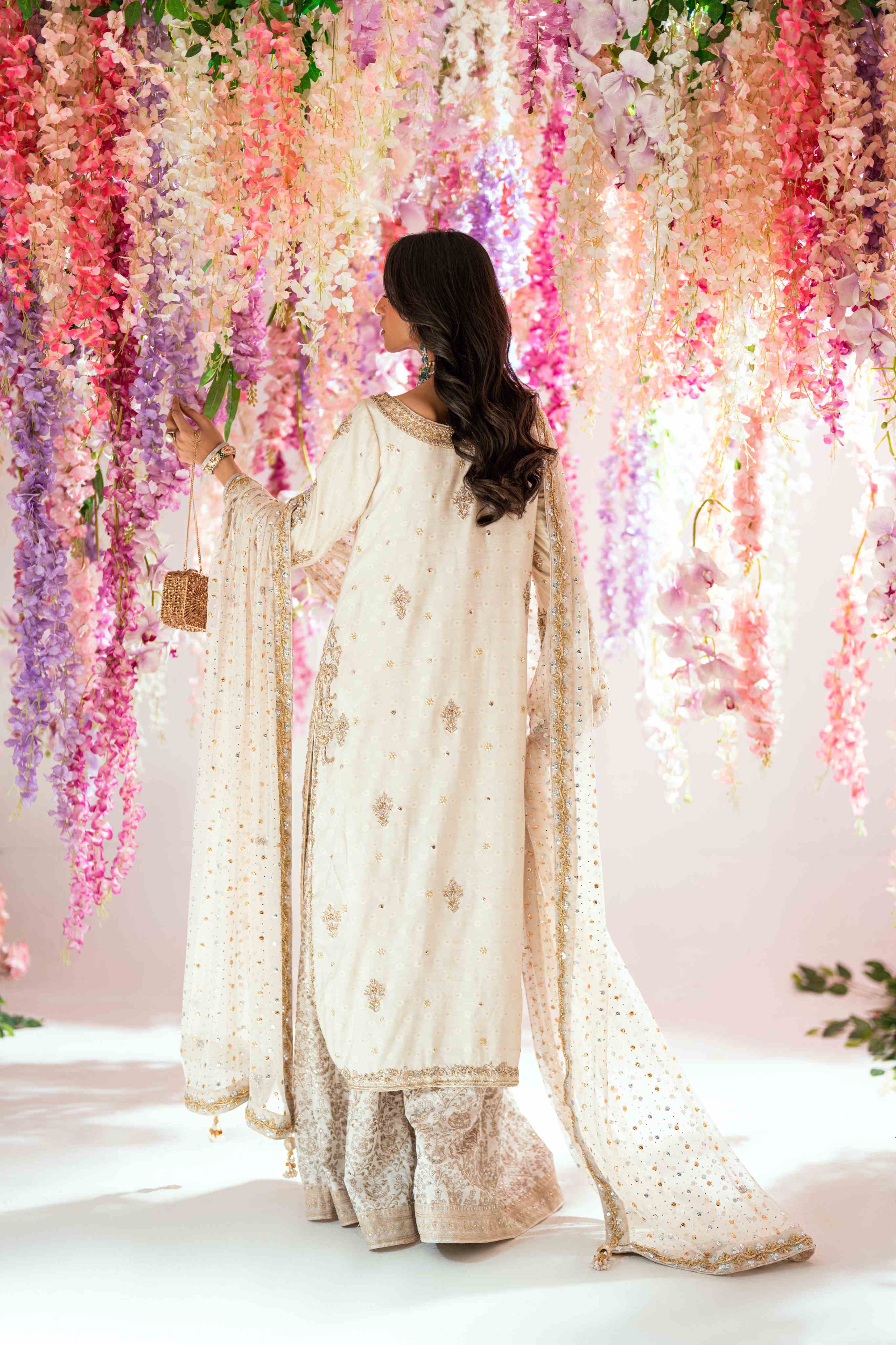 Off-white cotton net shirt with antique gold embroidery & zari detailing paired with embroidered dhaka pants & kamdani dupatta
